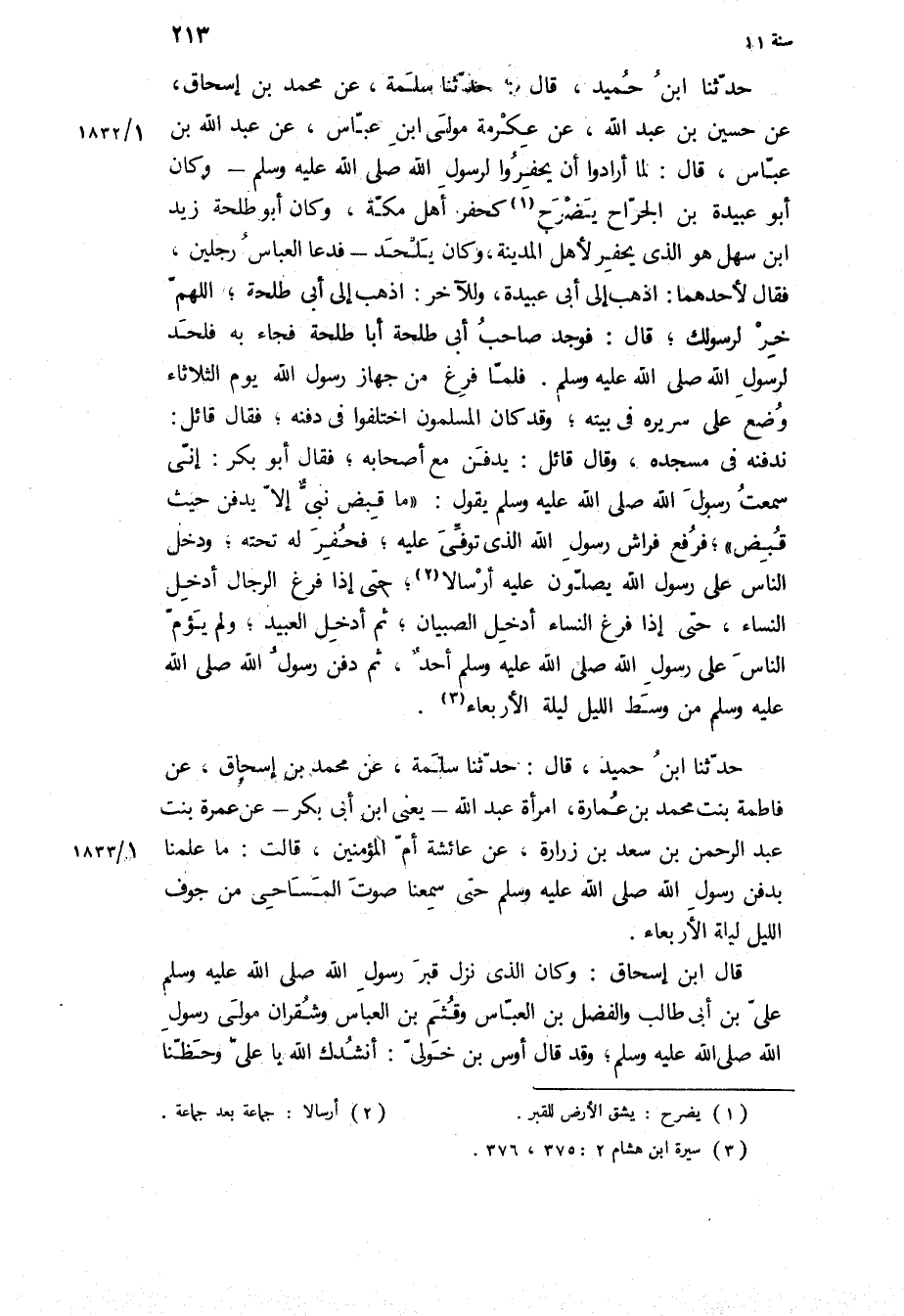 حَدَّثَنَا ابن حميد، قال: حَدَّثَنَا سلمة، عن مُحَمَّدِ بْنِ إِسْحَاقَ، عَنْ حُسَيْنِ بْنِ عَبْدِ اللَّهِ، عَنْ عِكْرِمَةَ مَوْلَى ابْنِ عَبَّاسٍ، عَنْ عَبْدِ اللَّهِ بْنِ عَبَّاسٍ، قَالَ: لَمَّا أَرَادُوا ان يحفروا لرسول الله ص- وَكَانَ أَبُو عُبَيْدَةَ بْنُ الْجَرَّاحِ يَضْرَحُ كَحَفْرِ اهل مكة، وكان ابو طلحه زيد ابن سَهْلٍ هُوَ الَّذِي يَحْفِرُ لأَهْلِ الْمَدِينَةِ، وَكَانَ يَلْحَدُ- فَدَعَا الْعَبَّاسُ رَجُلَيْنِ، فَقَالَ لأَحَدِهِمَا: اذْهَبْ إِلَى أَبِي عُبَيْدَةَ، وَلِلآخَرِ: اذْهَبْ إِلَى أَبِي طَلْحَةَ، اللَّهُمَّ خِرْ لِرَسُولِكَ، قَالَ: فَوَجَدَ صَاحِبُ أَبِي طَلْحَةَ أَبَا طَلْحَةَ فَجَاءَ بِهِ فَلَحَدَ لرسول الله ص فلما فرغ من جهاز رسول الله يَوْمَ الثُّلاثَاءِ وُضِعَ عَلَى سَرِيرِهِ فِي بَيْتِهِ، وَقَدْ كَانَ الْمُسْلِمُونَ اخْتَلَفُوا فِي دَفْنِهِ، فَقَالَ قَائِلٌ: