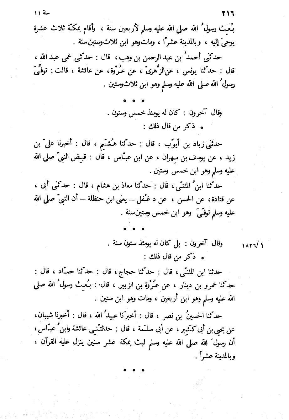 حَدَّثَنَا ابْنُ الْمُثَنَّى، قَالَ: حَدَّثَنَا مُعَاذُ بْنُ هِشَامٍ، قَالَ: حَدَّثَنِي أَبِي، عَنْ قَتَادَةَ، عَنِ الْحَسَنِ، عَنْ دَغْفَلٍ- يعنى ابن حنظله- ان النبي ص تُوُفِّيَ وَهُوَ ابْنُ خَمْسٍ وَسِتِّينَ سَنَةً.
