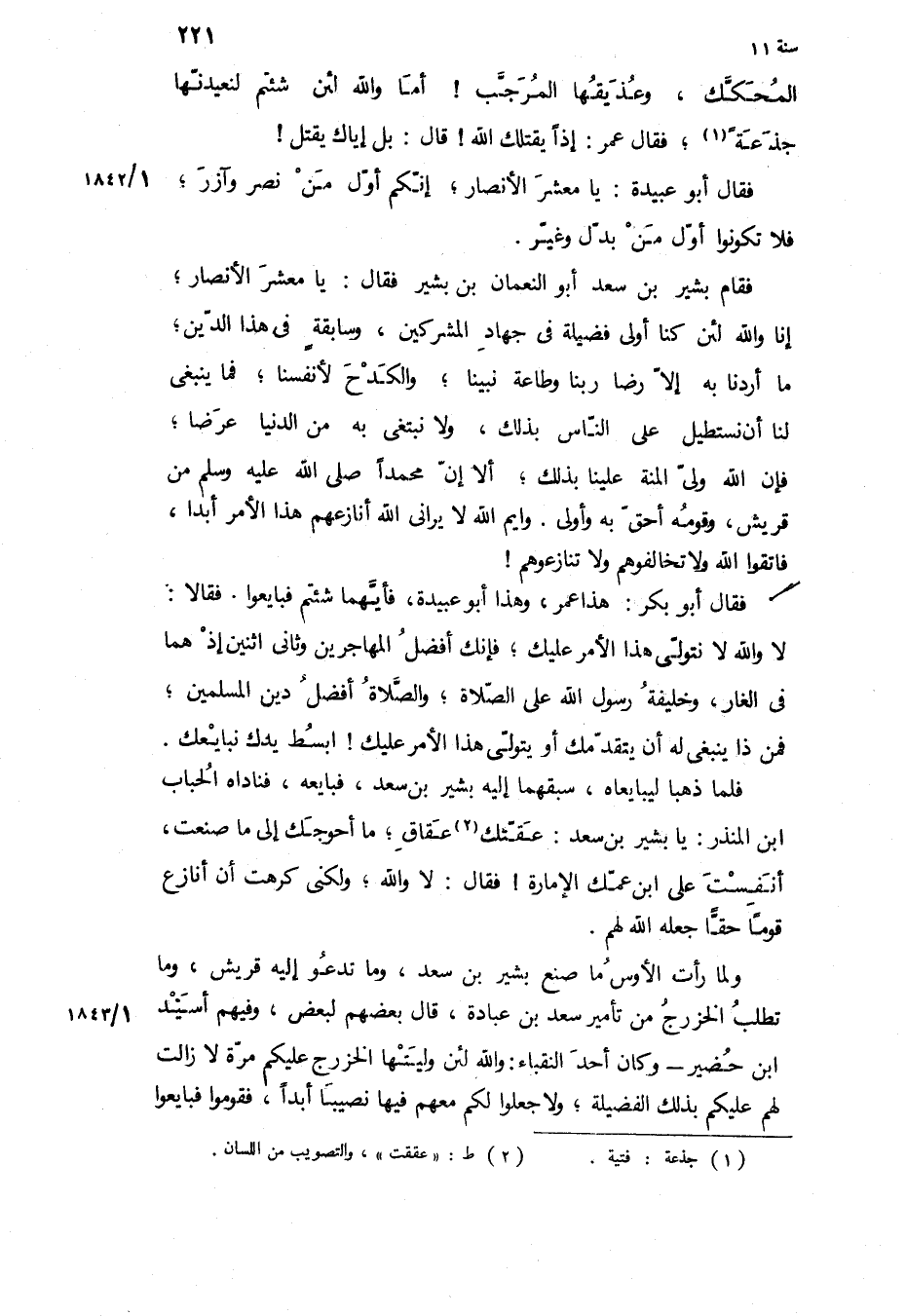 فقام بشير بْن سعد أبو النعمان بْن بشير فَقَالَ: يا معشر الأنصار، إنا والله لئن كنا أولي فضيلة فِي جهاد المشركين، وسابقة فِي هذا الدين، ما أردنا به إلا رضا ربنا وطاعة نبينا، والكدح لأنفسنا، فما ينبغي لنا أن نستطيل على الناس بذلك، ولا نبتغي به من الدنيا عرضا، فإن الله ولي المنة علينا بذلك، ألا ان محمدا ص من قريش، وقومه أحق به وأولى وايم الله لا يراني الله أنازعهم هذا الأمر أبدا، فاتقوا الله ولا تخالفوهم ولا تنازعوهم! فَقَالَ أبو بكر: هذا عمر، وهذا أبو عبيدة، فأيهما شئتم فبايعوا فقالا: