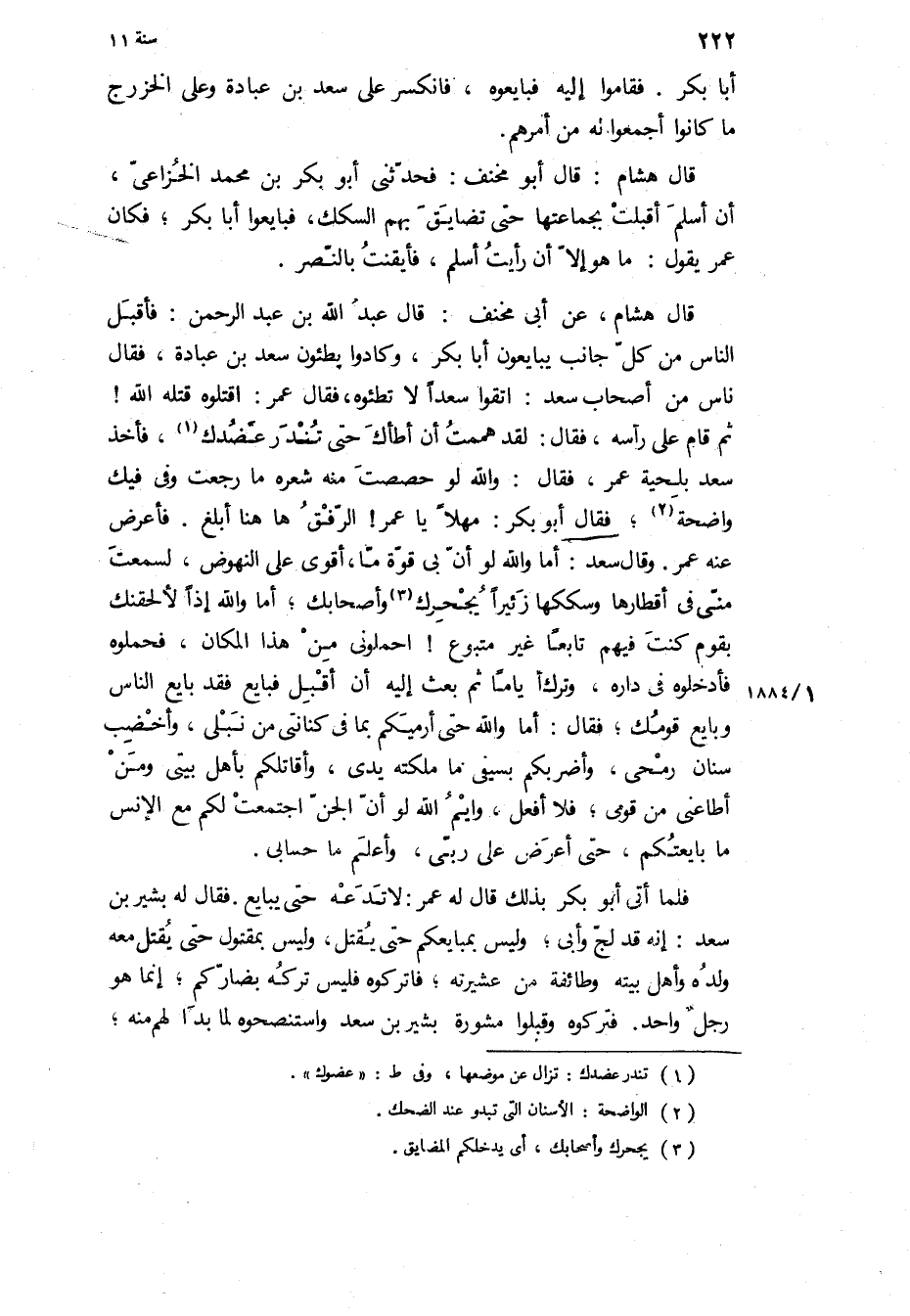 قَالَ هِشَام، عن أبي مخنف: قَالَ عَبْد اللَّه بْن عبد الرحمن: فأقبل الناس من كل جانب يبايعون أبا بكر، وكادوا يطئون سعد بْن عبادة، فَقَالَ ناس من أصحاب سعد: اتقوا سعدا لا تطئوه، فَقَالَ عمر: اقتلوه قتله اللَّه! ثُمَّ قام على رأسه، فَقَالَ: لقد هممت أن أطأك حَتَّى تندر عضدك، فأخذ سعد بلحية عمر، فَقَالَ: والله لو حصصت منه شعرة ما رجعت وفي فيك واضحة، فَقَالَ أبو بكر: مهلا يا عمر! الرفق هاهنا أبلغ فأعرض عنه عمر وقال سعد: أما والله لو أن بي قوة ما، أقوى على النهوض، لسمعت مني فِي أقطارها وسككها زئيرا يجحرك وأصحابك، أما والله إذا لألحقنك بقوم كنت فيهم تابعا غير متبوع! احملوني من هذا المكان، فحملوه فأدخلوه فِي داره، وترك أياما ثُمَّ بعث إليه أن أقبل فبايع فقد بايع الناس وبايع قومك، فَقَالَ: أما والله حَتَّى أرميكم بما فِي كنانتي من نبلي، وأخضب سنان رمحي، وأضربكم بسيفي ما ملكته يدي، وأقاتلكم بأهل بيتي ومن أطاعني من قومي، فلا أفعل، وايم الله لو أن الجن اجتمعت لكم مَعَ الإنس ما بايعتكم، حَتَّى أعرض على ربي، وأعلم ما حسابي.