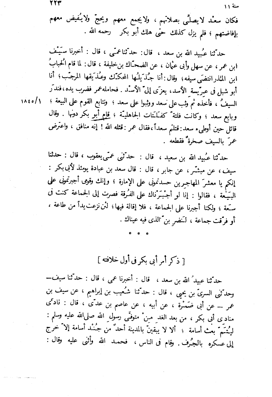 حَدَّثَنَا عُبَيْدُ اللَّهِ بْنُ سَعْدٍ، قَالَ: حدثنا عمى، قال: أخبرنا سيف ابن عُمَرَ، عَنْ سَهْلٍ وَأَبِي عُثْمَان، عَنِ الضَّحَّاكِ بن خليفه، قال: لما قام الحباب ابن الْمُنْذِرِ انْتَضَى سَيْفَهُ، وَقَالَ: أَنَا جُذَيْلُهَا الْمُحَكَّكُ وعذيقها المرجب، انا ابو شبل في عريسة الأَسَدِ، يُعْزَى إِلَى الأَسَدِ فَحَامَلَهُ عُمَرُ فَضَرَبَ يَدَهُ، فَنَدَرَ السَّيْفَ، فَأَخَذَهُ ثُمَّ وَثَبَ عَلَى سَعْدٍ وَوَثَبُوا عَلَى سَعْدٍ، وَتَتَابَعَ الْقَوْمُ عَلَى الْبَيْعَةِ، وَبَايَعَ سَعْدٌ، وَكَانَتْ فَلْتَةٌ كَفَلَتَاتِ الْجَاهِلِيَّةِ، قَامَ أَبُو بَكْرٍ دُونَهَا وَقَالَ قَائِلٌ حِينَ أُوطِئَ سَعْدٌ: قَتَلْتُمْ سَعْدًا، فَقَالَ عُمَرُ: قَتَلَهُ اللَّهُ! إِنَّهُ مُنَافِقٌ، وَاعْتَرَضَ عُمَرُ بِالسَّيْفِ صَخْرَةً فقطعه.