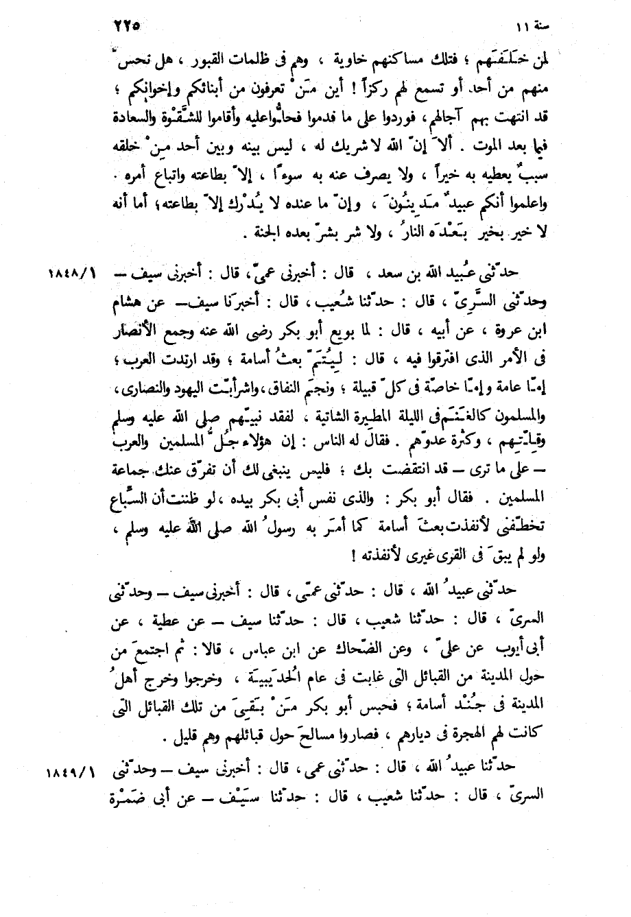 حَدَّثَنِي عُبَيْدُ اللَّهِ بْنُ سَعْدٍ، قَالَ: أَخْبَرَنِي عَمِّي، قَالَ: أَخْبَرَنِي سَيْفٌ- وَحَدَّثَنِي السَّرِيُّ، قَالَ: حَدَّثَنَا شُعَيْبٌ، قَالَ: أَخْبَرَنَا سَيْفٌ- عَنْ هِشَامِ ابن عُرْوَةَ، عَنْ أَبِيهِ، قَالَ: لَمَّا بُويِعَ أَبُو بَكْرٍ رَضِيَ اللَّهُ عَنْهُ وَجَمَعَ الأَنْصَارَ فِي الأَمْرِ الَّذِي افْتَرَقُوا فِيهِ، قَالَ: لَيُتَمَّ بَعْثُ أُسَامَةَ، وَقَدِ ارْتَدَّتِ الْعَرَبُ، إِمَّا عَامَّةً وَإِمَّا خَاصَّةً فِي كُلِّ قَبِيلَةٍ، وَنَجَمَ النِّفَاقُ، وَاشْرَأَبَّتِ الْيَهُودُ وَالنَّصَارَى، وَالْمُسْلِمُونَ كَالْغَنَمِ فِي اللَّيْلَةِ الْمَطِيرَةِ الشاتيه، لفقد نبيهم ص وَقِلَّتِهِمْ، وَكَثْرَةِ عَدُوُّهِمْ فَقَالَ لَهُ النَّاسُ: إِنَّ هَؤُلاءِ جُلُّ الْمُسْلِمِينَ وَالْعَرَبُ- عَلَى مَا تَرَى- قَدِ انْتُقِضَتْ بِكَ، فَلَيْسَ يَنْبَغِي لَكَ أَنْ تَفْرِقَ عَنْكَ جَمَاعَةَ الْمُسْلِمِينَ فَقَالَ أَبُو بَكْرٍ: وَالَّذِي نَفْسُ أَبِي بَكْرٍ بِيَدِهِ، لَوْ ظَنَنْتُ أَنَّ السِّبَاعَ تَخَطَّفَنِي لأَنْفَذْتُ بَعْثَ أُسَامَةَ كَمَا امر به رسول الله ص، وَلَوْ لَمْ يَبْقَ فِي الْقُرَى غَيْرِي لأَنْفَذْتُهُ! حَدَّثَنِي عُبَيْدُ اللَّهِ، قَالَ: حَدَّثَنِي عَمِّي، قَالَ: أَخْبَرَنِي سَيْفٌ- وَحَدَّثَنِي السَّرِيُّ، قَالَ: حَدَّثَنَا شُعَيْبٌ، قَالَ: حَدَّثَنَا سَيْفٌ- عَنْ عَطِيَّةَ، عَنْ أَبِي أَيُّوبَ عَنْ عَلِيٍّ، وَعَنِ الضَّحَّاكِ عَنِ ابْنِ عَبَّاسٍ، قَالا: ثُمَّ اجْتَمْعَ مَنْ حَوْلَ الْمَدِينَةِ مِنَ الْقَبَائِلِ الَّتِي غَابَتْ فِي عَامِ الْحُدَيْبِيَةِ، وَخَرَجُوا وَخَرَجَ أَهْلُ الْمَدِينَةِ فِي جُنْدِ أُسَامَةَ، فَحَبَسَ أَبُو بَكْرٍ مَنْ بَقِيَ مِنْ تِلْكَ الْقَبَائِلِ الَّتِي كَانَتْ لَهُمُ الْهِجْرَةُ فِي دِيَارِهِمْ، فَصَارُوا مَسَالِحَ حَوْلَ قَبَائِلِهِمْ وَهُمْ قَلِيلٌ.