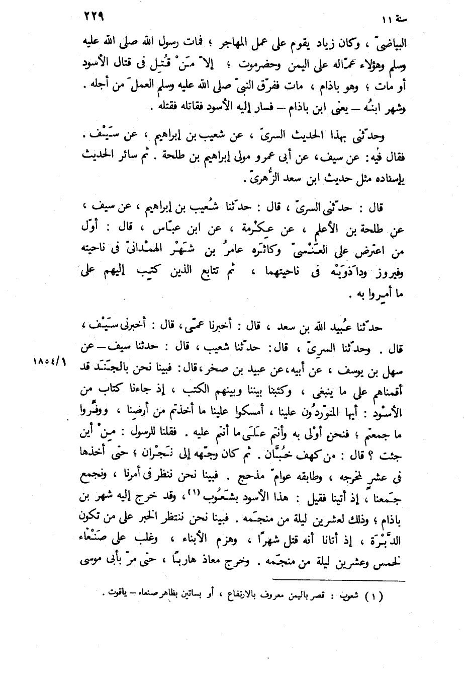 قَالَ: حَدَّثَنِي السَّرِيُّ، قَالَ: حَدَّثَنَا شُعَيْبُ بْنُ إِبْرَاهِيمَ، عَنْ سَيْفٍ، عَنْ طَلْحَةَ بْنِ الأَعْلَمِ، عَنْ عِكْرِمَةَ، عَنِ ابْنِ عَبَّاسٍ، قَالَ: أَوَّلُ مَنِ اعْتَرَضَ عَلَى الْعَنْسِيِّ وَكَاثَرَهُ عَامِرُ بْنُ شَهْرٍ الْهَمْدَانِيُّ فِي نَاحِيَتِهِ وَفَيْرُوزُ وَدَاذُوَيْهِ فِي نَاحِيَتِهِمَا، ثُمَّ تَتَابَعَ الَّذِينَ كَتَبَ إِلَيْهِمْ عَلَى مَا أُمِرُوا بِهِ حَدَّثَنَا عُبَيْدُ اللَّهِ بْنُ سَعْدٍ، قَالَ: أَخْبَرَنَا عَمِّي، قَالَ: أَخْبَرَنِي سَيْفٌ، قَالَ وَحَدَّثَنَا السَّرِيُّ، قَالَ: حَدَّثَنَا شُعَيْبٌ، قَالَ: حَدَّثَنَا سَيْفٌ- عَنْ سَهْلِ بْنِ يُوسُفَ، عَنْ أَبِيهِ، عَنْ عُبَيْدِ بْنِ صَخْرٍ، قَالَ فَبَيْنَا نَحْنُ بِالْجُنْدِ قَدْ أَقَمْنَاهُمْ عَلَى مَا يَنْبَغِي، وَكَتَبْنَا بَيْنَنَا وَبَيْنَهُمُ الْكُتُبَ، إِذْ جَاءَنَا كِتَابٌ مِنَ الأَسْوَدِ: أَيُّهَا الْمُتَوَرِّدُونَ عَلَيْنَا، أَمْسِكُوا عَلَيْنَا مَا أَخَذْتُمْ مِنْ أَرْضِنَا، وَوَفِّرُوا مَا جَمَعْتُمْ، فَنَحْنُ أَوْلَى بِهِ وَأَنْتُمْ عَلَى مَا أَنْتُمْ عَلَيْهِ فَقُلْنَا لِلرَّسُولِ: مِنْ أَيْنَ جِئْتَ؟ قَالَ: مِنْ كَهْفِ خُبَّانَ ثُمَّ كَانَ وَجْهُهُ إِلَى نَجْرَانَ، حَتَّى أَخَذَهَا فِي عَشْرٍ لِمَخْرَجِهِ، وَطَابَقَهُ عُوَّامُ مَذْحِجَ فَبَيْنَا نَحْنُ نَنْظُرُ فِي أَمْرِنَا، وَنَجْمَعُ جَمْعَنَا، إِذْ أَتِيَنَا فَقِيلَ: هَذَا الأَسْوَدُ بِشَعُوبٍ، وَقَدْ خَرَجَ إِلَيْهِ شَهْرُ بْنُ بِاذَامَ، وَذَلِكَ لِعِشْرِينَ لَيْلَةً مِنْ مَنْجَمِهِ فَبَيْنَا نَحْنُ نَنْتَظِرُ الْخَبَرَ عَلَى مَنْ تَكُونُ الدِّبْرَةُ، إِذْ أَتَانَا أَنَّهُ قَتَلَ شَهْرًا، وَهَزَمَ الأَبْنَاءَ، وَغَلَبَ عَلَى صَنْعَاءَ لِخَمْسٍ وَعِشْرِينَ لَيْلَةً مِنْ مَنْجَمِهِ وَخَرَجَ مُعَاذٌ هَارِبًا، حَتَّى مَرَّ بِأَبِي موسى