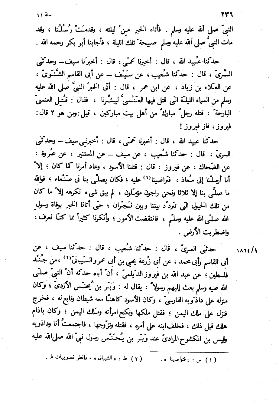 النبي ص فَأَتَاهُ الْخَبَرُ مِنْ لَيْلَتِهِ، وَقَدِمَتْ رُسُلُنَا، وَقَدْ مات النبي ص صَبِيحَةَ تِلْكَ اللَّيْلَةِ، فَأَجَابَنَا أَبُو بَكْرٍ رَحِمَهُ اللَّهُ حَدَّثَنَا عُبَيْدُ اللَّهِ، قَالَ: أَخْبَرَنَا عَمِّي، قال: أخبرنا سيف- وحدثني السري، قال: حدثنا شُعَيْبٌ، عَنْ سَيْفٍ- عَنْ أَبِي الْقَاسِمِ الشَّنَوِيِّ، عَنِ الْعَلاءِ بْنِ زِيَادٍ، عَنِ ابْنِ عُمَرَ، [قال: اتى الخبر النبي ص مِنَ السَّمَاءِ اللَّيْلَةَ الَّتِي قُتِلَ فِيهَا الْعَنْسِيُّ لِيُبَشِّرَنَا، فَقَالَ: قُتِلَ الْعَنْسِيُّ الْبَارِحَةَ، قَتَلَهُ رَجُلٌ مُبَارَكٌ مِنْ أَهْلِ بَيْتٍ مُبَارَكينَ، قِيلَ: وَمَنْ هو؟ قَالَ: