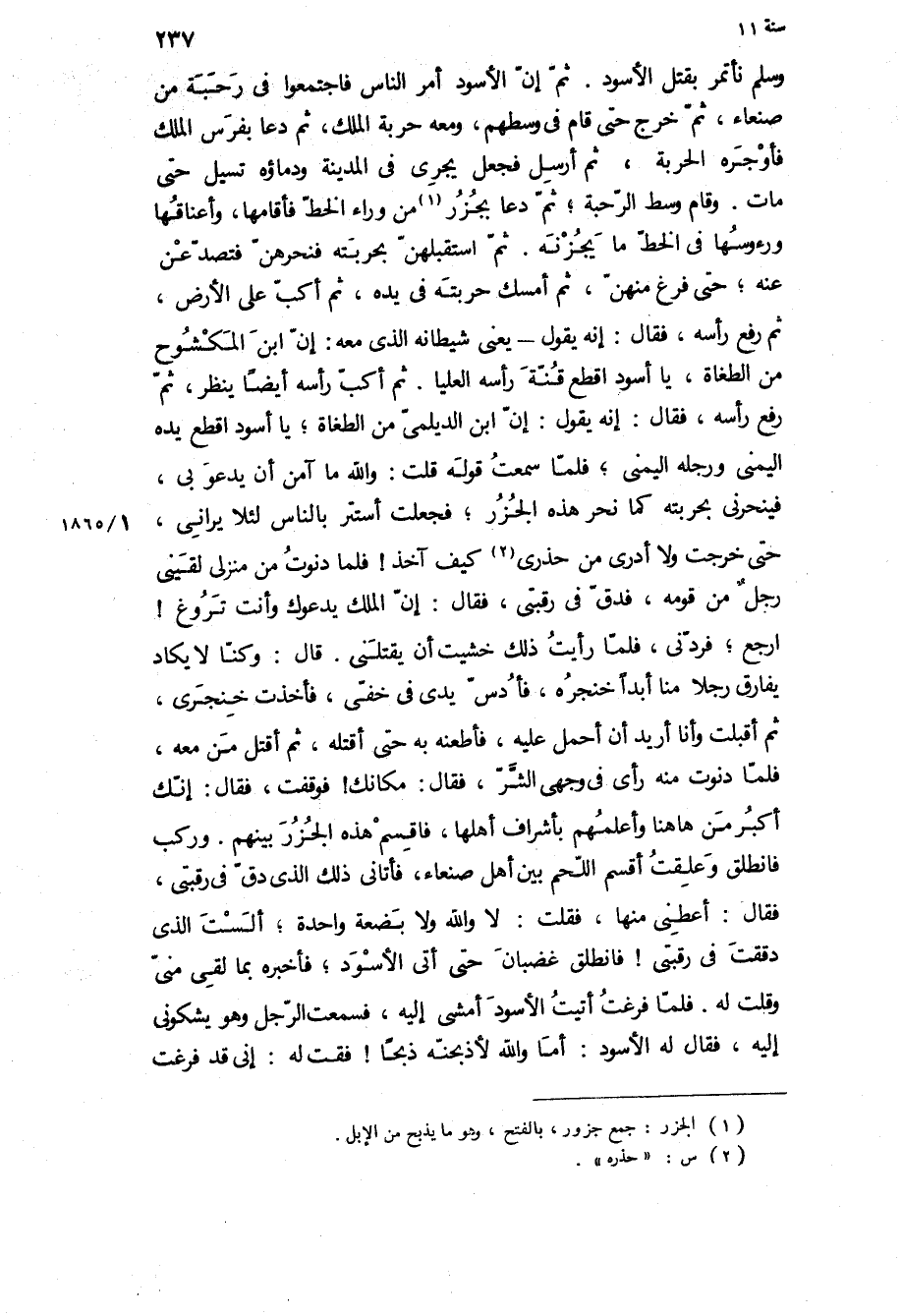 نَأْتَمِرُ بِقَتْلِ الأَسْوَدِ ثُمَّ إِنَّ الأَسْوَدَ أَمَرَ النَّاسَ فَاجْتَمَعُوا فِي رُحْبَةٍ مِنْ صَنْعَاءَ، ثُمَّ خَرَجَ حَتَّى قَامَ فِي وَسْطِهِمْ، وَمَعَهُ حَرْبَةُ الْمَلِكِ، ثُمَّ دَعَا بِفَرَسِ الْمَلِكِ فَأَوْجَرَهُ الْحَرْبَةَ، ثُمَّ أَرْسَلَ فَجَعَلَ يَجْرِي فِي الْمَدِينَةِ وَدِمَاؤُهُ تَسِيلُ حَتَّى مَاتَ وَقَامَ وَسَطَ الرُّحْبَةِ، ثُمَّ دَعَا بِجُزُرٍ مِنْ وَرَاءِ الْخَطِّ فَأَقَامَهَا، وَأَعْنَاقُهَا وَرُءُوسُهَا فِي الْخَطِّ مَا يَجُزْنَهُ ثُمَّ اسْتَقْبَلَهُنَّ بِحَرْبَتِهِ فَنَحَرَهُنَّ فَتَصَدَّعْنَ عَنْهُ، حَتَّى فَرَغَ مِنْهُنَّ، ثُمَّ أَمْسَكَ حَرْبَتَهُ فِي يَدِهِ، ثُمَّ أَكَبَّ عَلَى الأَرْضِ، ثُمَّ رَفَعَ رَأْسَهُ، فَقَالَ: إِنَّهُ يَقُولُ- يَعْنِي شَيْطَانَهُ الَّذِي مَعَهُ: إِنَّ ابْنَ الْمَكْشُوحِ مِنَ الطُّغَاةِ، يَا أَسْوَدُ اقْطَعْ قُنَّةَ راسه العليا ثم أكب رَأْسَهُ أَيْضًا يَنْظُرُ، ثُمَّ رَفَعَ رَأْسَهُ، فَقَالَ: إِنَّهُ يَقُولُ: إِنَّ ابْنَ الدَّيْلَمِيِّ مِنَ الطُّغَاةِ، يَا أَسْوَدُ اقْطَعْ يَدَهُ الْيُمْنَى وَرِجْلَهُ الْيُمْنَى، فلما سمعت قوله قلت: والله ما آمن أَنْ يَدْعُوَ بِي، فَيْنَحَرَنِي بِحَرْبَتِهِ كَمَا نَحَرَ هَذِهِ الْجُزُرَ، فَجَعَلْتُ أَسْتَتِرُ بِالنَّاسِ لِئَلا يَرَانِي، حَتَّى خَرَجْتُ وَلا أَدْرِي مِنْ حِذْرِي كَيْفَ آخُذُ! فَلَمَّا دَنَوْتُ مِنْ مَنْزِلِي لَقِيَنِي رَجُلٌ مِنْ قَوْمِهِ، فَدَقَّ فِي رَقَبَتِي، فَقَالَ: إِنَّ الْمَلِكَ يَدْعُوكَ وَأَنْتَ تَرُوغُ! ارْجِعْ، فَردَّنِي، فَلَمَّا رَأَيْتُ ذَلِكَ خَشِيتُ أَنْ يَقْتُلَنِي قَالَ: وَكُنَّا لا يَكَادُ يُفَارِقُ رَجُلا مِنَّا أَبَدًا خِنْجَرَهُ، فَأَدُسُّ يَدِي فِي خُفِّي، فَأَخَذْتُ خِنْجَرِي، ثُمَّ أَقْبَلْتُ وَأَنَا أُرِيدُ أَنْ أَحْمِلَ عَلَيْهِ، فَأَطْعَنَهُ بِهِ حَتَّى أَقْتُلَهُ، ثُمَّ أَقْتُلَ مَنْ مَعَهُ، فَلَمَّا دَنَوْتُ مِنْهُ رَأَى فِي وَجْهِي الشَّرَّ، فَقَالَ: مَكَانَكَ! فَوَقَفْتُ، فَقَالَ: إِنَّكَ أَكْبَرُ مَنْ هَاهُنَا وَأَعْلَمُهُمْ بِأَشْرَافِ أَهْلِهَا، فَاقْسِمْ هَذِهِ الْجُزُرَ بَيْنَهُمْ وَرَكِبَ فَانْطَلَقَ وَعَلَّقْتُ أُقْسِمُ اللَّحْمَ بَيْنَ أَهْلِ صَنْعَاءَ، فَأَتَانِي ذَلِكَ الَّذِي دَقَّ فِي رَقَبَتِي، فَقَالَ: أَعْطِنِي مِنْهَا، فَقُلْتُ: لا وَاللَّهِ وَلا بَضْعَةً وَاحِدَةً، أَلَسْتَ الَّذِي دَقَقْتَ فِي رَقَبَتِي! فَانْطَلَقَ غَضْبَانَ حَتَّى أَتَى الأَسْوَدَ، فَأَخْبَرَهُ بِمَا لَقِيَ مِنِّي وَقُلْتُ لَهُ فَلَمَّا فَرَغْتُ أَتَيْتُ الأَسْوَدَ أَمْشِي إِلَيْهِ، فَسَمِعْتُ الرَّجُلَ وَهُوَ يَشْكُونِي إِلَيْهِ، فَقَالَ لَهُ الأَسْوَدُ: أَمَا وَاللَّهِ لأَذْبَحَنَّهُ ذَبْحًا! فَقُلْتُ لَهُ: إِنِّي قَدْ فَرَغْتُ