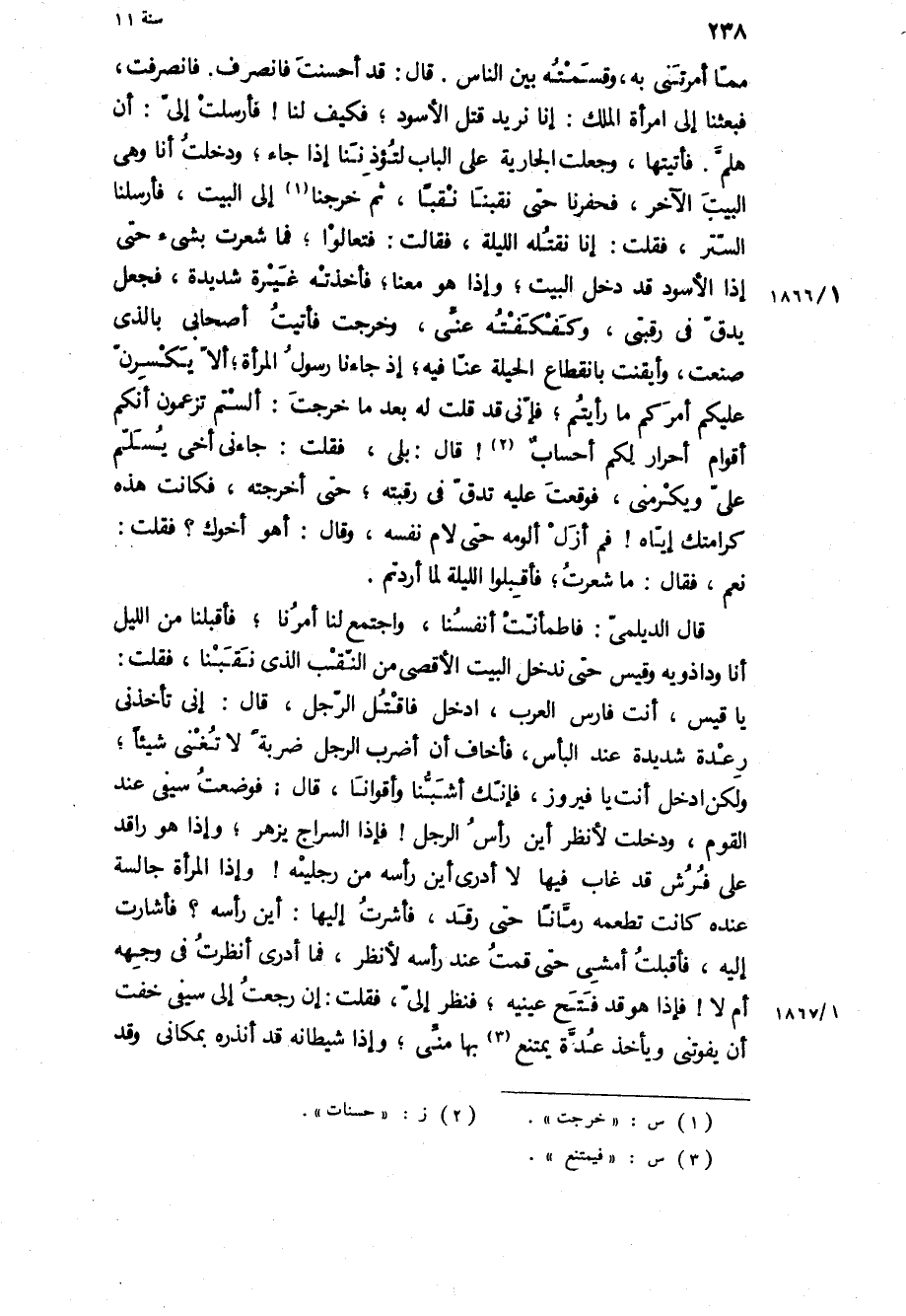 مِمَّا أَمَرْتَنِي بِهِ، وَقَسَّمْتُهُ بَيْنَ النَّاسِ قَالَ: قَدْ أَحْسَنْتَ فَانْصَرِفْ فَانْصَرَفْتُ، فَبَعَثْنَا إِلَى امْرَأَةِ الْمَلِكِ: أَنَّا نُرِيدُ قَتْلَ الأَسْوَدِ، فَكَيْفَ لَنَا! فَأَرْسَلَتْ إِلَيَّ: أَنْ هَلُمَّ فَأَتَيْتُهَا، وَجَعَلَتِ الْجَارِيَةَ عَلَى الْبَابِ لَتُؤْذِنَنَا إِذَا جَاءَ، وَدَخَلْتُ أَنَا وَهِيَ الْبَيْتَ الآخِرَ، فَحَفَرْنَا حَتَّى نَقَبْنَا نَقْبًا، ثُمَّ خَرَجْنَا إِلَى الْبَيْتِ، فَأَرْسَلْنَا السِّتْرَ، فَقُلْتُ: إِنَّا نَقْتُلُهُ اللَّيْلَةَ، فَقَالَتْ: فَتَعَالَوْا، فَمَا شَعَرْتُ بِشَيْءٍ حَتَّى إِذَا الأَسْوَدُ قَدْ دَخَلَ الْبَيْتَ، وَإِذَا هُوَ مَعَنَا، فَأَخَذَتْهُ غَيْرَةٌ شَدِيدَةٌ، فَجَعَلَ يَدُقُّ فِي رَقَبَتِي، وَكَفْكَفْتُهُ عَنِّي، وَخَرَجْتُ فَأَتَيْتُ أَصْحَابِي بِالَّذِي صَنَعْتُ، وَأَيْقَنْتُ بِانْقِطَاعِ الْحِيلَةِ عَنَّا فِيهِ، إِذْ جَاءَنَا رَسُولُ الْمَرْأَةِ، أَلا يَكْسِرِنَّ عَلَيْكُمْ أَمْرَكُمْ مَا رَأَيْتُمْ، فَإِنِّي قَدْ قُلْتُ له بعد ما خَرَجْتَ: أَلَسْتُمْ تَزْعُمُونَ أَنَّكُمْ أَقْوَامُ أَحْرَارٍ لَكُمْ أَحْسَابٌ! قَالَ: بَلَى، فَقُلْتُ: جَاءَنِي أَخِي يُسَلِّمُ عَلَيَّ وَيُكْرِمُنِي، فَوَقَعْتَ عَلَيْهِ تَدُقُّ فِي رَقَبَتِهِ، حتى اخرجته، فكانت هذه كرامتك اياه! فم أَزَلْ أَلُومُهُ حَتَّى لامَ نَفْسَهُ، وَقَالَ: أَهُوَ أَخُوكِ؟ فَقُلْتُ: