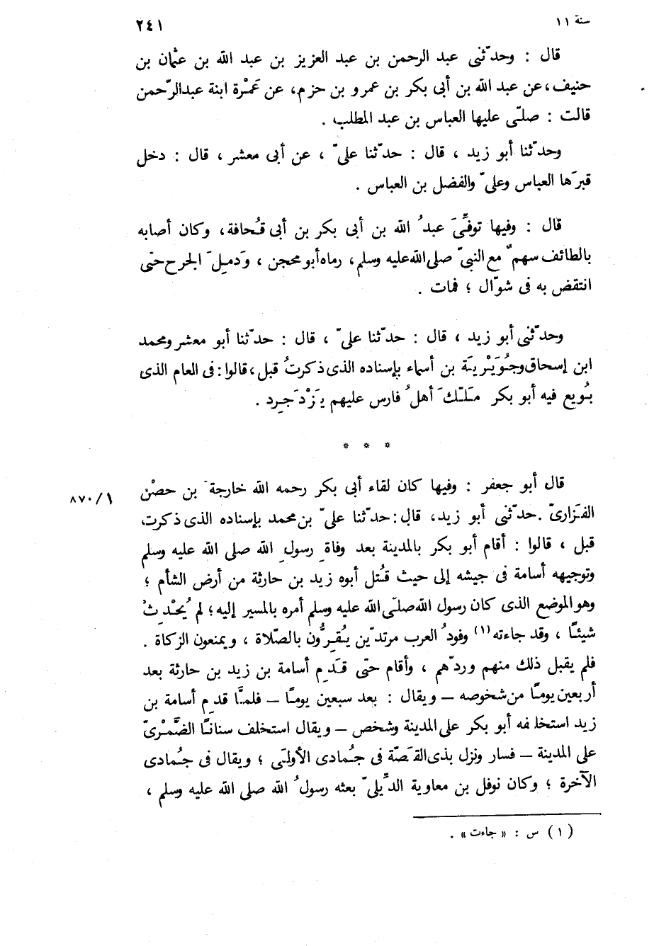 قَالَ أبو جعفر: وفيها كان لقاء أبي بكر رحمه الله خارجة بْن حصن الفزاري حَدَّثَنِي أَبُو زَيْد، قَالَ: حَدَّثَنَا عَلِيُّ بْنُ محمد بإسناده الَّذِي ذكرت قبل، قالوا: أقام أبو بكر بالمدينة بعد وفاة رَسُول اللَّهِ ص وتوجيهه أسامة فِي جيشه إلى حيث قتل أبوه زيد بْن حارثة من أرض الشام، وهو الموضع الذى كان رسول الله ص امره بالمسير إليه، لم يحدث شَيْئًا، وقد جاءته وفود العرب مرتدين يقرون بالصلاة، ويمنعون الزكاة.