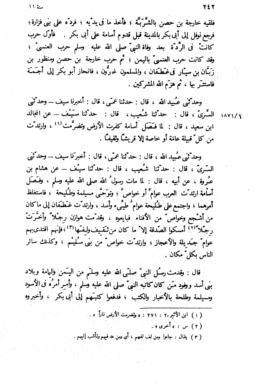 وحدثني عبيد الله، قَالَ: حَدَّثَنَا عمي، قَالَ: أخبرنا سيف- وحدثني السري، قال: حدثنا شعيب، قال: حدثنا سَيْفٍ- عَنْ هِشَامُ بْنُ عُرْوَةَ، عَنْ أَبِيهِ، قَالَ: لَمَّا مات رَسُول اللَّهِ ص، وفصل أسامة ارتدت العرب عوام أو خواص، وتوحى مسيلمة وطليحة، فاستغلظ أمرهما، واجتمع على طليحة عوام طيئ وأسد، وارتدت غطفان إلى ما كان من أشجع وخواص من الأفناء فبايعوه، وقدمت هَوَازِن رجلا وأخرت رجلا أمسكوا الصدقه الا ما كان من ثقيف ولفها، فإنهم اقتدى بهم عوام جديلة والأعجاز، وارتدت خواص من بني سليم، وكذلك سائر الناس بكل مكان.