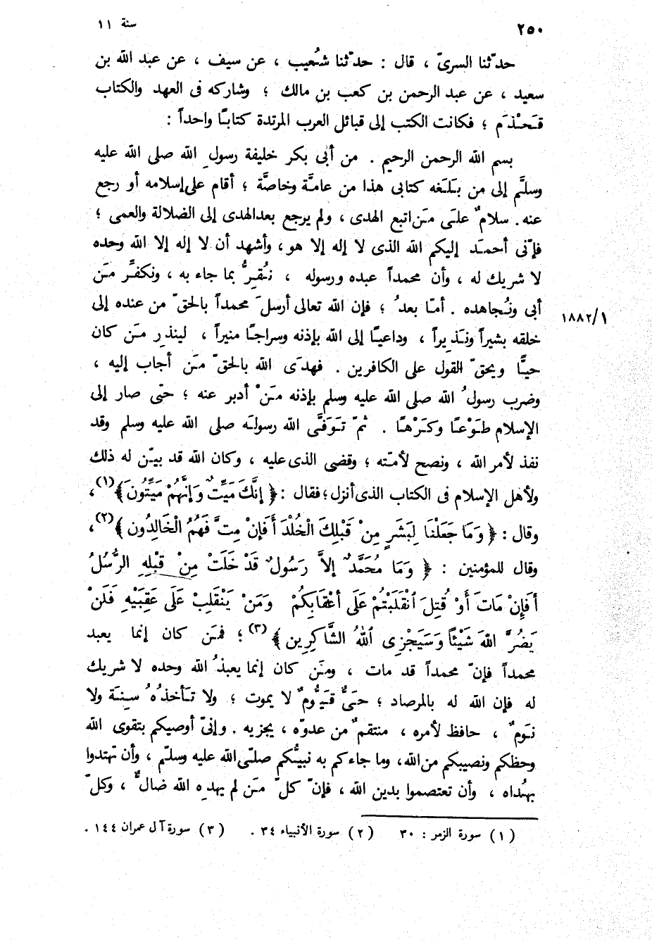 بِسْمِ اللَّهِ الرَّحْمَنِ الرَّحِيمِ مِنْ أَبِي بَكْرٍ خَلِيفَةِ رَسُولِ اللَّهِ ص إِلَى مَنْ بَلَغَهُ كِتَابِي هَذَا مِنْ عَامَّةٍ وَخَاصَّةٍ، أَقَامَ عَلَى إِسْلامِهِ أَوْ رَجَعَ عَنْهُ سَلامٌ عَلى مَنِ اتَّبَعَ الْهُدى، وَلَمْ يَرْجِعْ بَعْدَ الْهُدَى إِلَى الضَّلالَةِ وَالْعَمَى، فَإِنِّي أَحْمَدُ إِلَيْكُمُ اللَّهَ الَّذِي لا إِلَهَ إِلا هُوَ، وَأَشْهَدُ أَنْ لا إِلَهَ إِلا اللَّهُ وَحْدَهُ لا شَرِيكَ لَهُ، وَأَنَّ مُحَمَّدًا عَبْدُهُ وَرَسُولُهُ، نُقِرُّ بِمَا جَاءَ بِهِ، وَنُكَفِّرُ مَنْ أَبَى وَنُجَاهِدُهُ أَمَّا بَعْدُ، فَإِنَّ اللَّهَ تَعَالَى أَرْسَلَ مُحَمَّدًا بِالْحَقِّ مِنْ عِنْدِهِ إِلَى خَلْقِهِ بَشِيرًا وَنَذِيرًا، وَداعِياً إِلَى اللَّهِ بِإِذْنِهِ وَسِراجاً مُنِيراً، لِيُنْذِرَ مَنْ كانَ حَيًّا وَيَحِقَّ الْقَوْلُ عَلَى الْكافِرِينَ فَهَدَى اللَّهُ بِالْحَقِّ مَنْ أَجَابَ إِلَيْهِ.