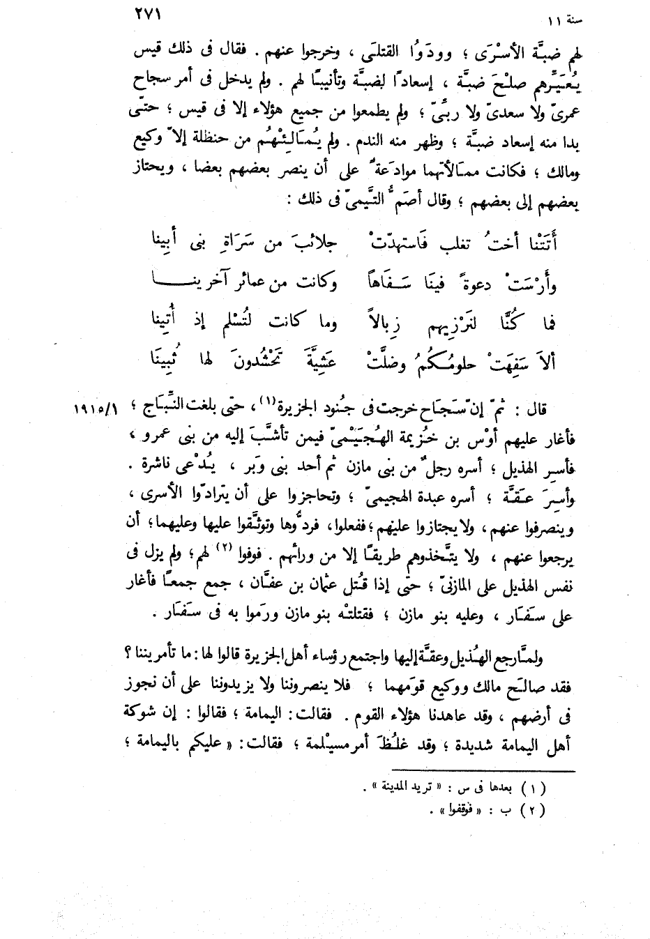 لهم ضبة الأسرى، وودوا القتلى، وخرجوا عنهم فَقَالَ فِي ذَلِكَ قيس يعيرهم صلح ضبة، إسعادا لضبة وتأنيبا لهم ولم يدخل فِي أمر سجاح عمري ولا سعدي ولا ربي، ولم يطمعوا من جميع هؤلاء إلا فِي قيس، حَتَّى بدا مِنْهُ إسعاد ضبة، وظهر مِنْهُ الندم ولم يمالئهم من حنظلة إلا وكيع ومالك، فكانت ممالأتهما موادعة على أن ينصر بعضهم بعضا، ويحتاز بعضهم إلى بعضهم، وقال أصم التيمي فِي ذَلِكَ: