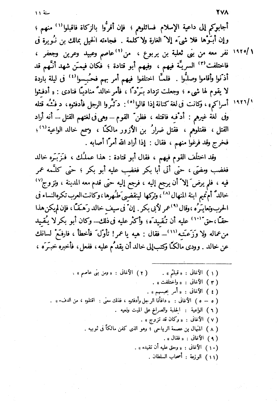 أَجَابُوكُمْ إِلَى دَاعِيَةِ الإِسْلامِ فَسَائِلُوهُمْ، فَإِنْ أَقَرُّوا بِالزَّكَاةِ فَاقْبَلُوا مِنْهُمْ، وَإِنْ أَبَوْهَا فَلا شَيْءٌ إِلا الْغَارَةُ وَلا كَلِمَةٌ فَجَاءَتْهُ الْخَيْلُ بِمَالِكِ بْنِ نُوَيْرَةَ فِي نَفَرٍ مَعَهُ مِنْ بَنِي ثَعْلَبَةَ بْنِ يَرْبُوعٍ، مِنْ عَاصِمٍ وَعُبَيْدٍ وَعُرَيْنٍ وَجَعْفَرٍ، فَاخْتَلَفَتِ السَّرِيَّةُ فِيهِمْ، وَفِيهِمْ أَبُو قَتَادَةَ، فَكَانَ فِيمَنْ شَهِدَ أَنَّهُمْ قَدْ أَذَّنُوا وَأَقَامُوا وَصَلَّوْا فَلَمَّا اخْتَلَفُوا فِيهِمْ أَمَرَ بِهِمْ فَحُبِسُوا فِي لَيْلَةٍ بَارِدَةٍ لا يَقُومُ لَهَا شَيْءٌ، وَجَعَلَتْ تَزْدَادُ بَرْدًا، فَأَمَرَ خَالِدٌ مُنَادِيًا فَنَادَى: ادفئوا اسراكم، وكانت في لغة كنانه إذا قَالُوا: دَثِّرُوا الرَّجُلَ فَأَدْفِئُوهُ، دِفْئُهُ قَتْلُهُ وَفِي لُغَةِ غَيْرِهِمْ: أَدْفِهِ فَاقْتُلْهُ، فَظَنَّ الْقَوْمُ- وَهِيَ فِي لُغَتِهِمِ الْقَتْلُ- أَنَّهُ أَرَادَ الْقَتْلَ، فَقَتَلُوهُمْ، فَقَتَلَ ضِرَارُ بْنُ الأَزْوَرِ مَالِكًا، وَسِمَع خَالِدٌ الْوَاعِيَةَ، فَخَرَجَ وَقَدْ فَرَغُوا مِنْهُمْ، فَقَالَ: إِذَا أَرَادَ اللَّهُ أَمْرًا أَصَابَهُ.