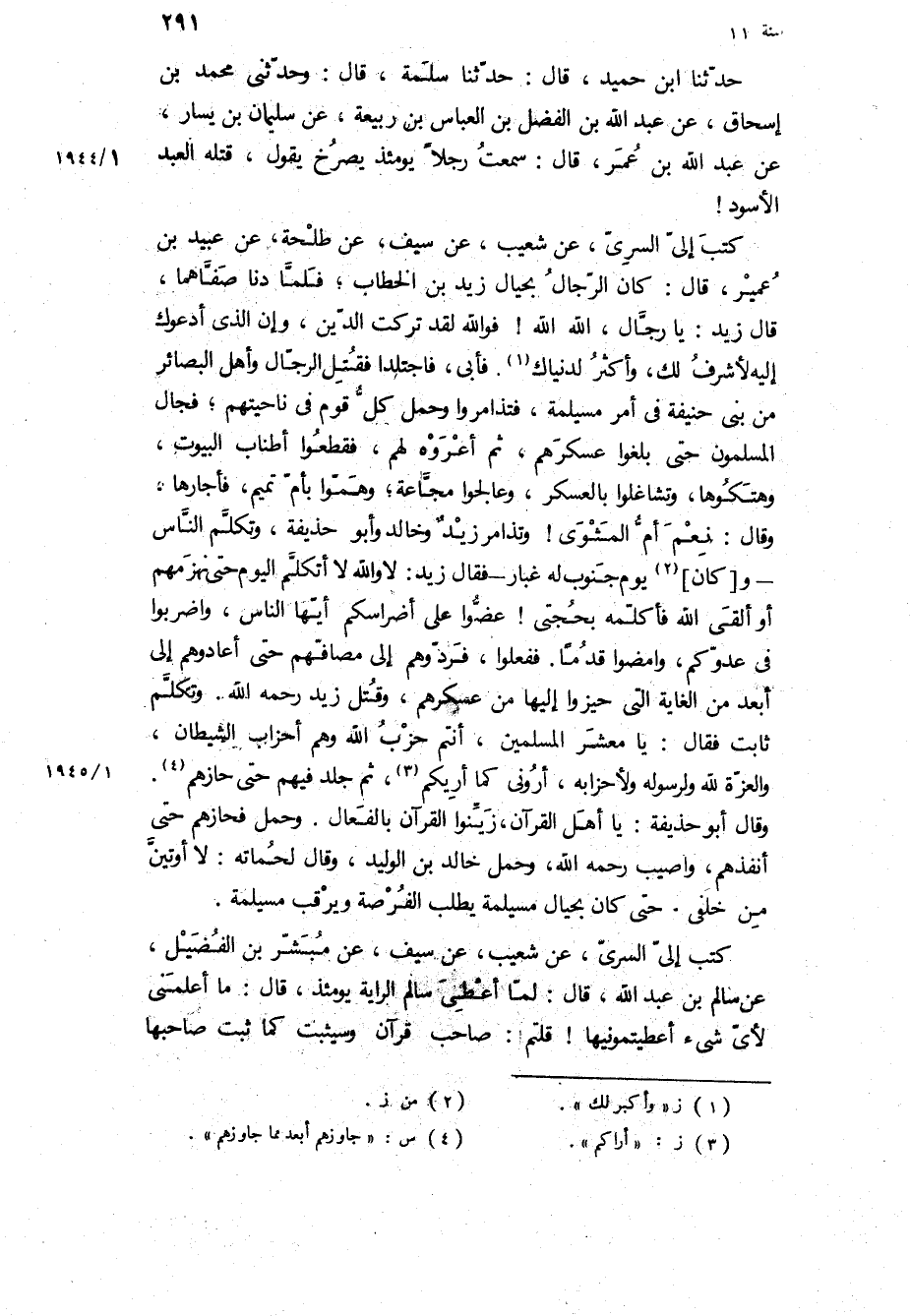 حدثنا ابن حميد، قال: حدثنا سلمة، قال: وَحَدَّثَنِي مُحَمَّدُ بْنُ إِسْحَاقَ، عَنْ عَبْدِ اللَّهِ بْنِ الْفَضْلِ بْنِ الْعَبَّاسِ بْنِ رَبِيعَةَ، عَنْ سُلَيْمَانَ بْنِ يَسَارٍ، عَنْ عَبْدِ اللَّهِ بْنِ عُمَرَ، قَالَ: سَمِعْتُ رَجُلا يَوْمَئِذٍ يَصْرُخُ يَقُولُ، قَتَلَهُ الْعَبْدُ الأَسْوَدُ! كَتَبَ إِلَيَّ السَّرِيُّ، عَنْ شعيب، عن سيف، عَنْ طَلْحَةَ، عَنْ عُبَيْدِ بْنِ عُمَيْرٍ، قَالَ: كَانَ الرَّجَّالُ بِحِيَالِ زَيْدِ بْنِ الْخَطَّابِ، فَلَمَّا دَنَا صَفَّاهُمَا، قَالَ زَيْدٌ: يَا رَجَّالُ، اللَّهَ الله! فو الله لَقَدْ تَرَكْتَ الدِّينَ، وَإِنَّ الَّذِي أَدْعُوكَ إِلَيْهِ لأَشْرَفُ لَكَ، وَأَكْثَرُ لِدُنْيَاكَ فَأَبَى، فَاجْتَلَدَا فَقُتِلَ الرِّجَّالُ وَأَهْلُ الْبَصَائِرِ مِنْ بَنِي حَنِيفَةَ فِي أَمْرِ مُسَيْلِمَةَ، فَتَذَامَرُوا وَحَمَلَ كُلُّ قَوْمٍ فِي نَاحِيَتِهِمْ، فَجَالَ الْمُسْلِمُونَ حَتَّى بَلَغُوا عَسْكَرَهُمْ، ثُمَّ أَعْرُوهُ لَهُمْ، فَقَطَعُوا أَطْنَابَ الْبُيُوتِ، وَهَتَكُوهَا، وَتَشَاغَلُوا بِالْعَسْكَرِ، وَعَالَجُوا مُجَّاعَةَ، وَهَمُّوا بِأُمِّ تَمِيمٍ، فَأَجَارَهَا، وَقَالَ: نِعْمَ أُمُّ الْمَثْوَى! وَتَذَامَرَ زَيْدٌ وَخَالِدٌ وَأَبُو حُذَيْفَةَ، وَتَكَلَّمَ النَّاسُ- وَكَانَ يَوْمَ جَنُوبٍ لَهُ غُبَارٌ- فَقَالَ زَيْدٌ: لا وَاللَّهِ لا أَتَكَلَّمُ الْيَوْمَ حَتَّى نَهْزِمَهُمْ أَوْ أَلْقَى اللَّهَ فَأُكَلِّمَهُ بِحُجَّتِي! عَضُّوا عَلَى أَضْرَاسِكُمْ أَيُّهَا النَّاسُ، وَاضْرِبُوا فِي عَدُوِّكُمْ، وَامْضُوا قُدُمًا فَفَعَلُوا، فَرَدُّوهُمْ إِلَى مُصَافِّهِمْ حَتَّى أَعَادُوهُمْ إِلَى أَبْعَدِ مِنَ الْغَايَةِ الَّتِي حُيِّزُوا إِلَيْهَا مِنْ عَسْكَرِهِمْ، وَقُتِلَ زَيْدٌ رَحِمَهُ اللَّهُ وَتَكَلَّمَ ثَابِتٌ فَقَالَ: يَا مَعْشَرَ الْمُسْلِمِينَ، أَنْتُمْ حِزْبُ اللَّهِ وَهُمْ أَحْزَابُ الشَّيْطَانِ، وَالْعِزَّةُ لِلَّهِ وَلِرَسُولِهِ وَلأَحْزَابِهِ، أَرُونِي كَمَا أُرِيكُمْ، ثُمَّ جَلَدَ فِيهِمْ حَتَّى حَازَهُمْ.