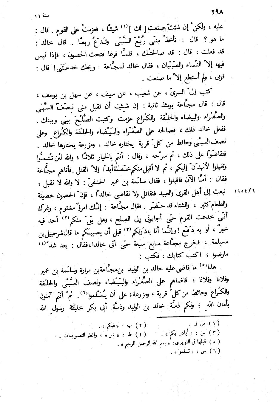 هذا ما قاضى عليه خالد بْن الوليد مجاعة بْن مرارة وسلمة بْن عمير وفلانا وفلانا، قاضاهم على الصفراء والبيضاء ونصف السبي والحلقة والكراع وحائط من كل قرية، ومزرعة، على أن يسلموا ثم أنتم آمنون بأمان اللَّه، ولكم ذمة خالد بْن الوليد وذمة أبي بكر خليفة رسول اللَّه