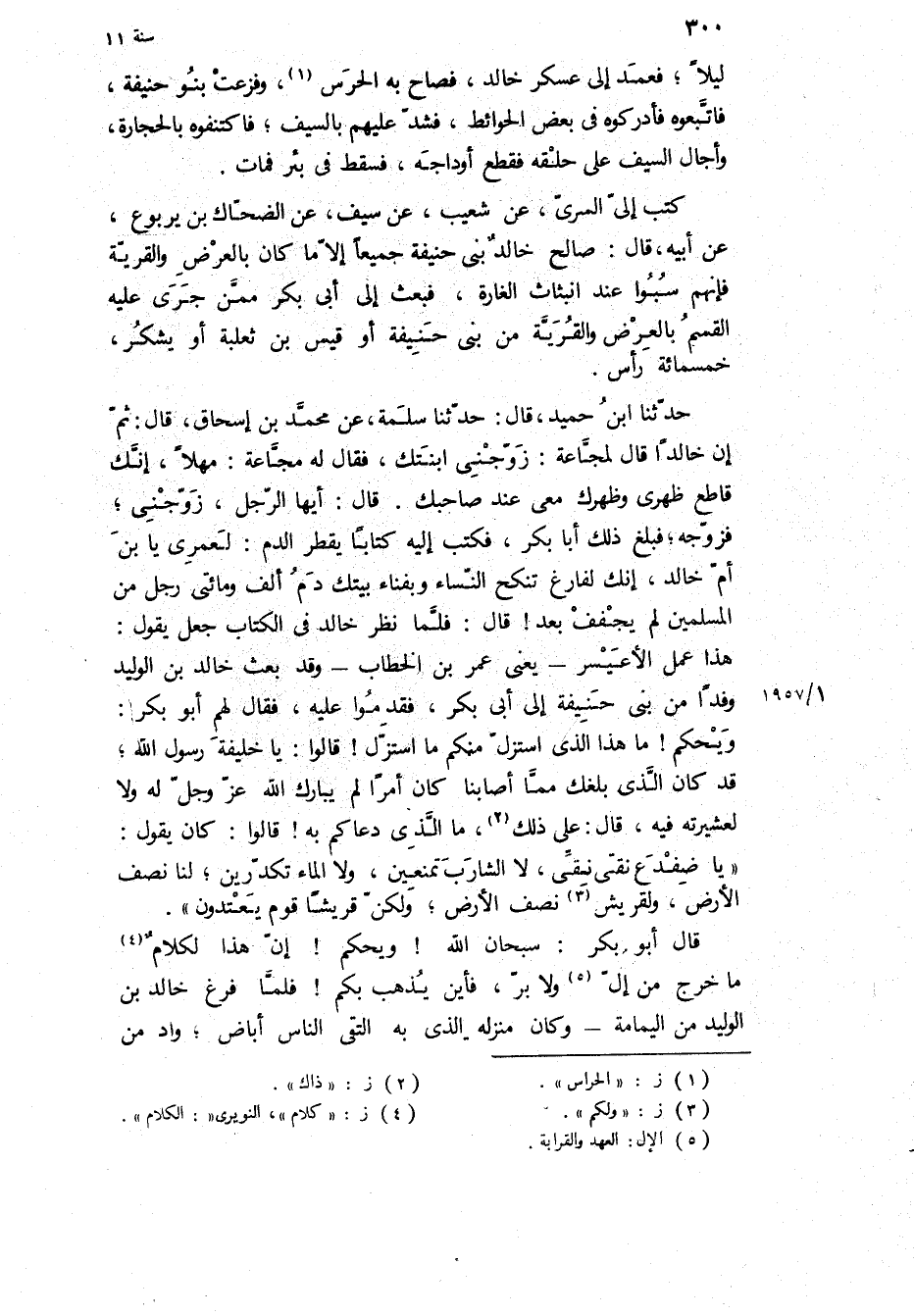 حَدَّثَنَا ابْنُ حُمَيْدٍ، قَالَ: حَدَّثَنَا سَلَمَةُ، عَنْ مُحَمَّدِ بْنِ إِسْحَاقَ، قَالَ: ثُمَّ إِنَّ خَالِدًا قَالَ لِمُجَّاعَةَ: زَوِّجْنِي ابْنَتَكَ، فَقَالَ لَهُ مُجَّاعَةُ: مَهْلا، إِنَّكَ قَاطِعٌ ظَهْرِي وَظَهْرَكَ مَعِي عِنْدَ صَاحِبِكَ قَالَ: أَيُّهَا الرَّجُلُ، زَوِّجْنِي، فَزَوَّجَهُ، فَبَلَغَ ذَلِكَ أَبَا بَكْرٍ، فَكَتَبَ إِلَيْهِ كِتَابًا يقطر الدم: لعمري يا بن أُمِّ خَالِدٍ، إِنَّكَ لَفَارِغٌ تَنْكِحُ النِّسَاءَ وَبِفِنَاءِ بَيْتِكَ دَمُ أَلْفٍ وَمِائَتَيْ رَجُلٍ مِنَ الْمُسْلِمِينَ لَمْ يَجْفُفْ بَعْدُ! قَالَ: فَلَمَّا نَظَرَ خَالِدٌ فِي الْكِتَابِ جَعَلَ يَقُولُ: