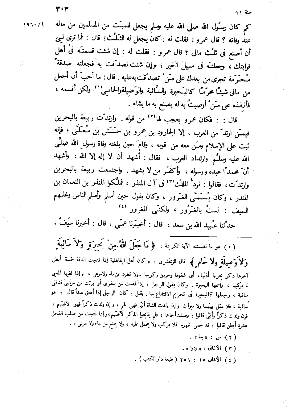 كم كان رسول الله ص يَجْعَلُ لِلْمَيِّتِ مِنَ الْمُسْلِمِينَ مِنْ مَالِهِ عِنْدَ وَفَاتِهِ؟ قَالَ عَمْرٌو: فَقُلْتُ لَهُ: كَانَ يَجْعَلُ لَهُ الثُّلُثَ، قَالَ: فَمَا تَرَى لِي أَنْ أَصْنَعَ فِي ثُلُثِ مَالِي؟ قَالَ عَمْرٌو: فَقُلْتُ لَهُ: إِنْ شِئْتَ قَسَّمْتَهُ فِي أَهْلِ قَرَابَتِكَ، وَجَعَلْتَهُ فِي سَبِيلِ الْخَيْرِ، وَإِنْ شِئْتَ تَصَدَّقْتَ بِهِ فَجَعَلْتَهُ صَدَقَةً مُحَرَّمَةً تَجْرِي مِنْ بَعْدِكَ عَلَى مَنْ تَصَدَّقْتَ بِهِ عَلَيْهِ قَالَ: مَا أُحِبُّ أَنْ أَجْعَلَ مِنْ مَالِي شَيْئًا مُحَرَّمًا كَالْبُحَيْرَةِ وَالسَّائِبَةِ وَالْوَصِيلَةِ وَالْحَامِي وَلَكِنْ أُقَسِّمُهُ، فَأُنْفِذُهُ عَلَى مَنْ أَوْصَيْتُ بِهِ لَهُ يَصْنَعُ بِهِ مَا يَشَاءُ قَالَ:: فَكَانَ عَمْرٌو يَعْجَبُ لَهَا مِنْ قَوْلِهِ وَارْتَدَّتْ رَبِيعَةُ بِالْبَحْرَيْنِ فِيمَنِ ارْتَدَّ مِنَ الْعَرَبِ، إِلا الْجَارُودَ بْنَ عَمْرِو بْنِ حَنَشِ بْنِ مُعَلَّى، فَإِنَّهُ ثَبَتَ عَلَى الإِسْلامِ وَمَنْ مَعَهُ مِنْ قَوْمِهِ، وَقَامَ حِينَ بَلَغَتْهُ وفاه رسول الله ص وَارْتِدَادُ الْعَرَبِ، فَقَالَ: أَشْهَدُ أَنْ لا إِلَهَ إِلا اللَّهُ، وَأَشْهَدُ أَنَّ مُحَمَّدًا عَبْدُهُ وَرَسُولُهُ، وَأُكَفِّرُ مَنْ لا يَشْهَدُ وَاجْتَمَعَتْ رَبِيعَةُ بِالْبَحْرَيْنِ وَارْتَدَّتْ، فَقَالُوا: نَرُدُّ الْمُلْكَ فِي آلِ الْمُنْذِرِ، فَمَلَّكُوا الْمُنْذِرَ بْنَ النُّعْمَانِ بْنِ الْمُنْذِرِ، وَكَانَ يُسَمَّى الْغَرُورَ، وَكَانَ يَقُولُ حِينَ أَسْلَمَ وَأَسْلَمَ النَّاسُ وَغَلَبَهُمُ السَّيْفُ: لَسْتُ بِالْغَرُورِ، وَلَكِنِّي الْمَغْرُورُ حدثنا عبيد الله بن سعد، قال: أخبرنا عمي، قال: أخبرنا سيف،
