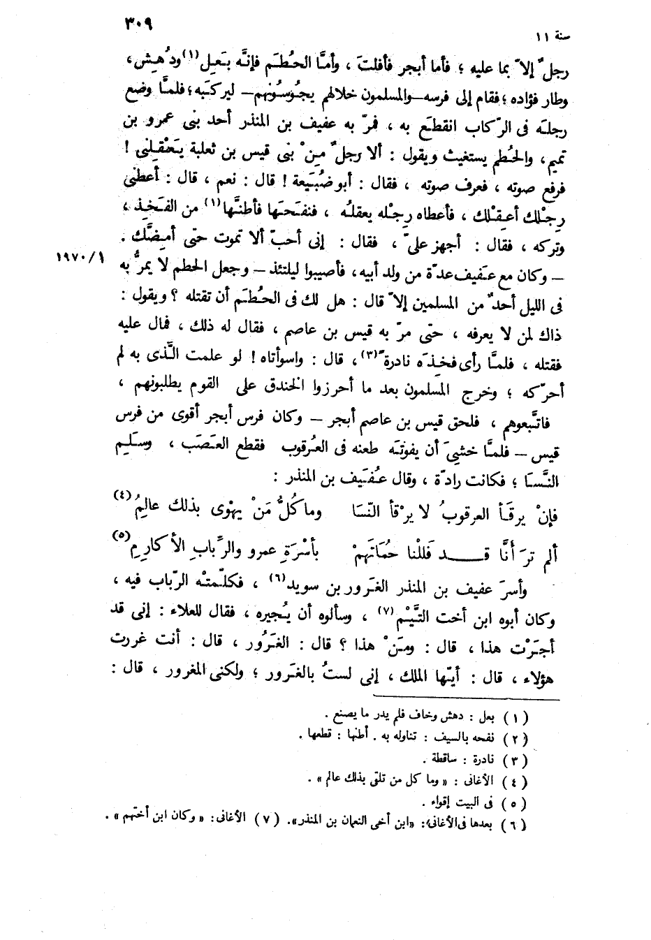 رَجُلٌ إِلا بِمَا عَلَيْهِ، فَأَمَّا أَبْجَرُ فَأَفْلَتَ، وَأَمَّا الْحطمُ فَإِنَّهُ بَعِلَ وَدَهِشَ، وَطَارَ فُؤَادُهُ، فَقَامَ إِلَى فَرَسِهِ- وَالْمُسْلِمُونَ خِلالُهُمْ يَجُوسُونَهُمْ- لِيَرْكَبَهُ، فَلَمَّا وَضَعَ رِجْلَهُ فِي الرِّكَابِ انْقَطَعَ بِهِ، فَمَرَّ بِهِ عَفِيفُ بْنُ الْمُنْذِرِ أَحَدُ بَنِي عَمْرِو بْنِ تَمِيمٍ، وَالحطمُ يَسْتَغِيثُ وَيَقُولُ: أَلا رَجُلٌ مِنْ بَنِي قَيْسِ بْنِ ثَعْلَبَةَ يَعْقِلُنِي! فَرَفَعَ صَوْتَهُ، فَعَرَفَ صَوْتَهُ، فَقَالَ: أَبُو ضُبَيْعَةَ! قَالَ: نَعَمْ، قَالَ: أَعْطِنِي رِجْلَكَ أُعْقِلَكَ، فَأَعْطَاهُ رِجْلَهُ يَعْقِلَهُ، فَنَفَحَهَا فَأَطَنَّهَا مِنَ الْفَخِذِ، وتَرَكَهُ، فَقَالَ: أَجْهِزْ عَلَيَّ، فَقَالَ: إِنِّي أُحِبُّ أَلا تَمُوتَ حَتَّى أمضكَ.