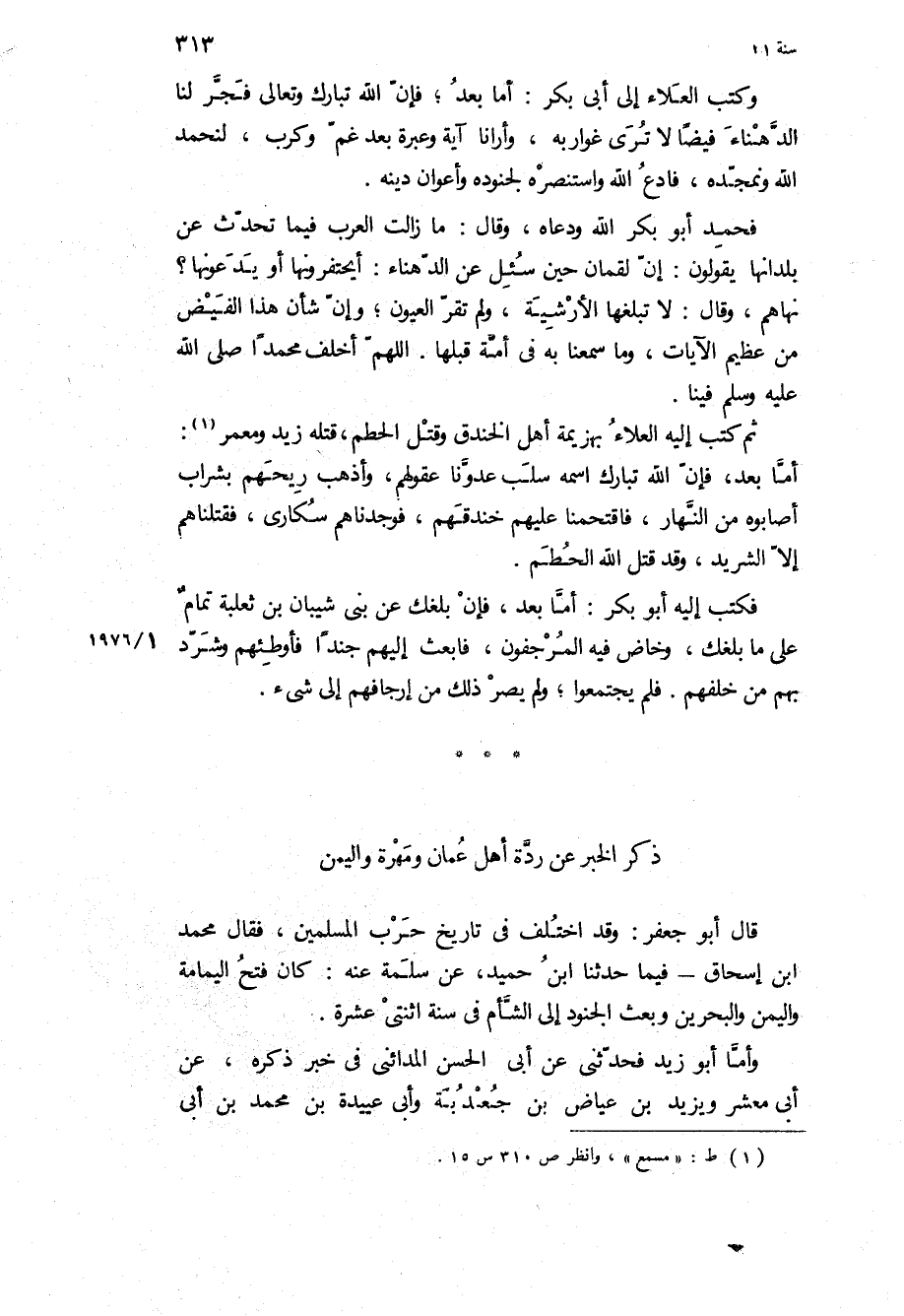 قال أبو جعفر: وقد اختلف في تاريخ حرب المسلمين، فقال محمد ابن إسحاق- فيما حَدَّثَنَا ابْنُ حُمَيْدٍ، عن سلمة عنه: كان فتح اليمامة واليمن والبحرين وبعث الجنود إلى الشام في سنة اثنتي عشرة.