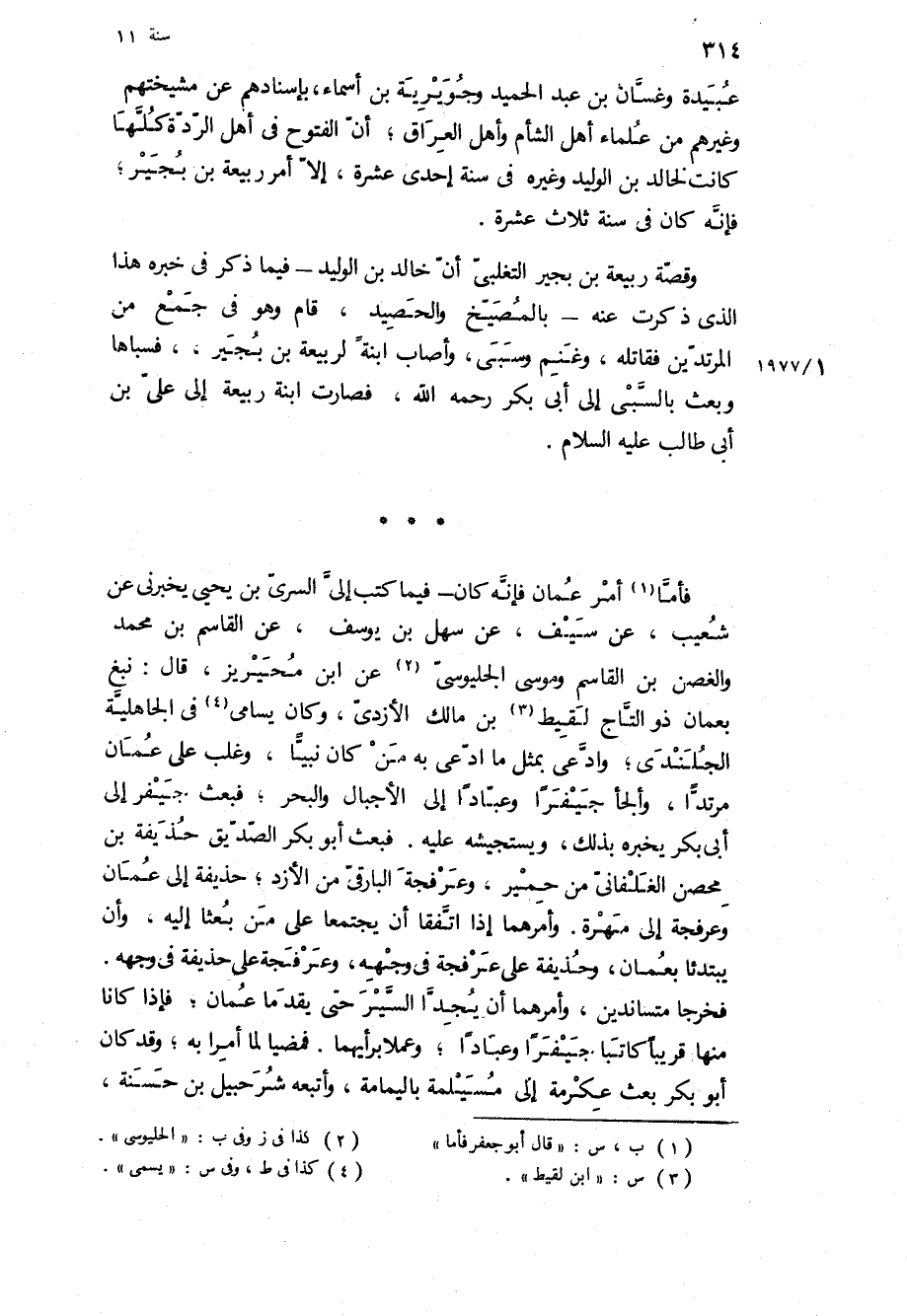 فأما أمر عمان فإنه كان- فيما كَتَبَ إِلَيَّ السَّرِيُّ بْن يحيى يخبرني عَنْ شُعَيْبٍ، عَنْ سَيْفٍ، عَنْ سَهْلِ بْنِ يوسف، عن القاسم بْن مُحَمَّد والغصن بْن القاسم وموسى الجليوسى عن ابن محيريز، قال: نبغ بعمان ذو التاج لقيط بْن مالك الأزدي، وكان يسامي في الجاهلية الجلندي، وادعى بمثل ما ادعى به من كان نبيا، وغلب على عمان مرتدا، وألجأ جيفرا وعبادا الى الاجبال والبحر، فبعث جيفر إلى أبي بكر يخبره بذلك، ويستجيشه عليه فبعث أبو بكر الصديق حذيفة بْن محصن الغلفاني من حمير، وعرفجة البارقي من الأزد، حذيفة إلى عمان وعرفجة إلى مهرة وأمرهما إذا اتفقا أن يجتمعا على من بعثا إليه، وأن يبتدئا بعمان، وحذيفة على عرفجة في وجهه، وعرفجة على حذيفة في وجهه.