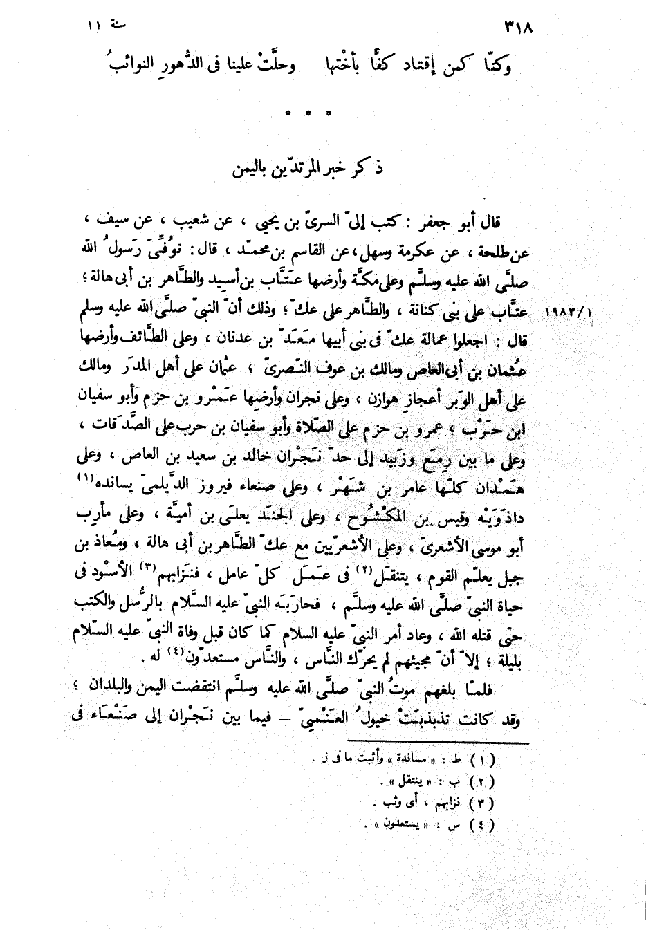 قَالَ أَبُو جَعْفَرٍ: كَتَبَ إِلَيَّ السَّرِيُّ بْنُ يَحْيَى، عَنْ شُعَيْبٍ، عَنْ سَيْفٍ، عَنْ طَلْحَةَ، عَنْ عِكْرِمَةَ وَسَهْلٍ، عَنِ الْقَاسِمِ بْنِ مُحَمَّدٍ، قال: توفى رسول الله ص وَعَلَى مَكَّةَ وَأَرْضِهَا عَتَّابُ بْنُ أُسَيْدٍ وَالطَّاهِرُ بْنُ أَبِي هَالَةَ، عَتَّابٌ عَلَى بَنِي كِنَانَةَ، والطاهر على عك، وذلك ان النبي ص قَالَ: اجْعَلُوا عِمَالَةَ عَكٍّ فِي بَنِي أَبِيهَا مَعْدِ بْنِ عَدْنَانَ، وَعَلَى الطَّائِفِ وَأَرْضِهَا عُثْمَانُ بْنُ أَبِي الْعَاصِ وَمَالِكُ بْنُ عَوْفٍ النَّصْرِيُّ، عُثْمَانُ عَلَى أَهْلِ الْمَدَرِ وَمَالِكٌ عَلَى أَهْلِ الْوَبَرِ أَعْجَازِ هَوَازِنَ، وَعَلَى نَجْرَانَ وَأَرْضِهَا عَمْرُو بن حزم وابو سفيان ابن حَرْبٍ، عَمْرُو بْنُ حَزْمٍ عَلَى الصَّلاةِ وَأَبُو سُفْيَانَ بْنُ حَرْبٍ عَلَى الصَّدَقَاتِ، وَعَلَى مَا بَيْنَ رَمْعٍ وَزَبيد إِلَى حَدِّ نَجْرَانَ خَالِدُ بْنُ سَعِيدِ بْنِ الْعَاصِ، وَعَلَى هَمْدَانَ كُلِّهَا عَامِرُ بْنُ شَهْرٍ، وَعَلَى صَنْعَاءَ فَيْرُوزُ الدَّيْلَمِيُّ يسانده داذويهِ وَقَيْسُ بْنُ الْمَكْشُوحِ، وَعَلَى الْجُنْدِ يَعْلَى بْنُ أُمَيَّةَ، وَعَلَى مَأْربِ أَبُو مُوسَى الأَشْعَرِيُّ، وَعَلَى الأَشْعَرِيِّينَ مَعَ عَكٍّ الطَّاهِرُ بْنُ أَبِي هَالَةَ، وَمُعَاذُ بْنُ جَبَلٍ يُعَلِّمُ الْقَوْمَ، يَتْنَقِلُ فِي عَمَلِ كُلِّ عَامِلٍ، فَنَزَا بِهِمُ الأَسْوَدُ في حياه النبي ص، فحاربه النبي ع بِالرُّسُلِ وَالْكُتُبِ حَتَّى قَتَلَهُ اللَّهُ، وَعَادَ أَمْرُ النبي ع كما كان قبل وفاه النبي ع بِلَيْلَةٍ، إِلا أَنَّ مَجِيئَهُمْ لَمْ يُحَرِّكِ النَّاسَ، وَالنَّاسُ مُسْتَعِدُّونَ لَهُ.