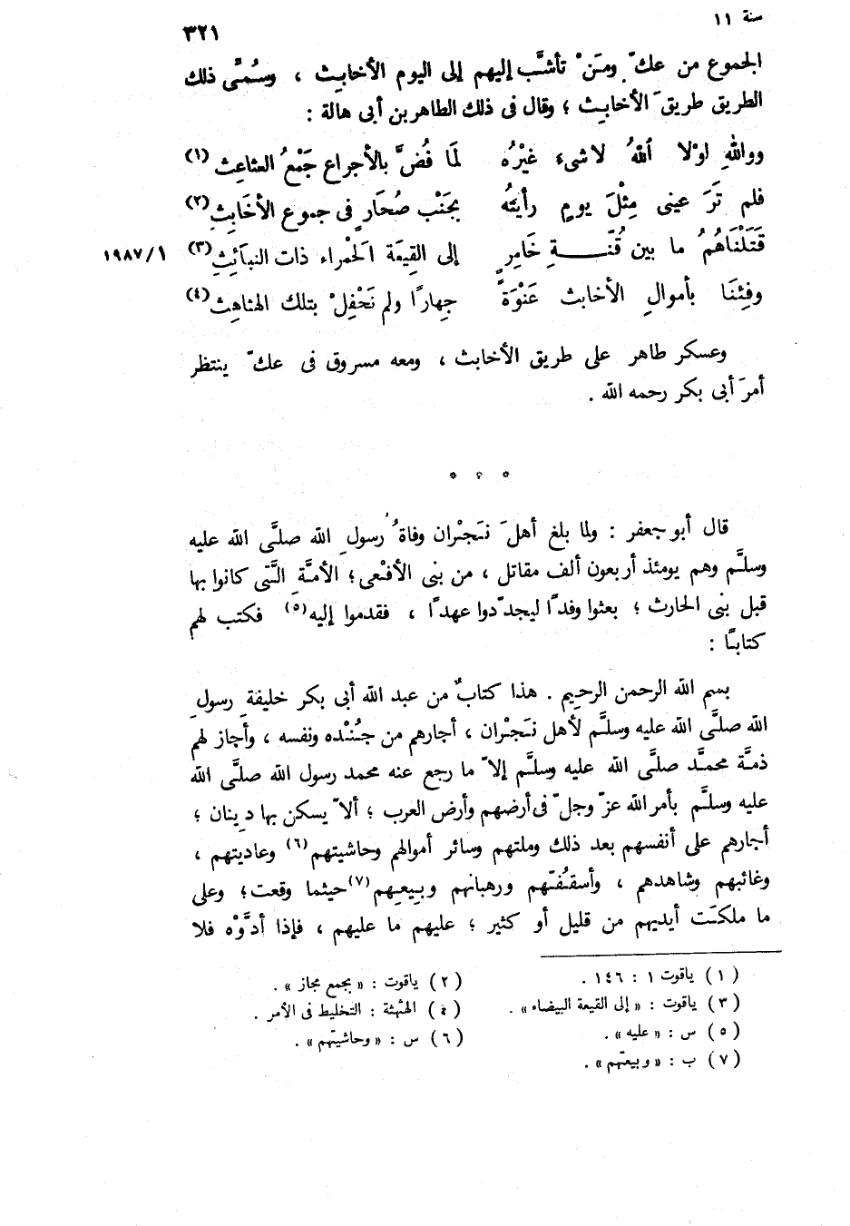 بِسْمِ اللَّه الرَّحْمَنِ الرَّحِيمِ هَذَا كِتَابٌ مِنْ عبد اللَّه أبي بكر خليفه رسول الله ص لأهل نجران، أجارهم من جنده ونفسه، وأجاز لهم ذمه محمد ص إلا ما رجع عنه مُحَمَّد رسول اللَّه ص بأمر اللَّه عز وجل في أرضهم وأرض العرب، ألا يسكن بها دينان، أجارهم على أنفسهم بعد ذلك وملتهم وسائر أموالهم وحاشيتهم وعاديتهم، وغائبهم وشاهدهم، وأسقفهم ورهبانهم وبيعهم حيثما وقعت، وعلى ما ملكت أيديهم من قليل أو كثير، عليهم ما عليهم، فإذا أدوه فلا