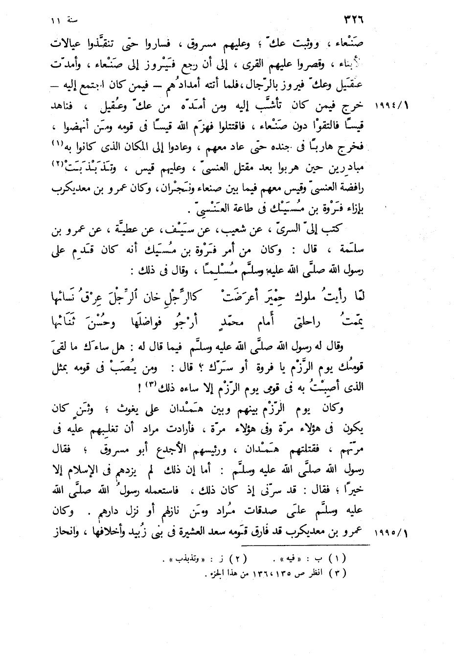 صَنْعَاءَ، وَوَثَبَتْ عَكٌّ، وَعَلَيْهِمْ مَسْرُوقٌ، فَسَارُوا حَتَّى تَنَقَّذُوا عِيَالاتِ الأَبْنَاءِ، وَقَصَرُوا عَلَيْهِمُ الْقُرَى، إِلَى أَنْ رَجَعَ فَيْرُوزُ إِلَى صَنْعَاءَ، وَأَمَدَّتْ عُقَيْلٌ وَعَكٌّ فَيْرُوزَ بِالرِّجَالِ، فَلَمَّا أَتَتْهُ أَمْدَادُهُمْ- فِيمَنْ كَانَ اجْتَمَعَ إِلَيْهِ- خَرَجَ فِيمَنْ كَانَ تَأَشَّبَ إِلَيْهِ وَمَنْ أَمَدَّهُ مِنْ عَكٍّ وَعُقَيْلٍ، فَنَاهَدَ قَيْسًا فَالْتَقُوا دُونَ صَنْعَاءَ، فَاقْتَتَلُوا فَهَزَمَ اللَّهُ قَيْسًا فِي قَوْمِهِ وَمَنْ أُنْهِضُوا، فَخَرَجَ هَارِبًا فِي جُنْدِهِ حَتَّى عَادَ مَعَهُمْ، وَعَادُوا إِلَى الْمَكَانِ الَّذِي كَانُوا بِهِ مُبَادِرِينَ حِينَ هَرَبُوا بَعْدَ مَقْتَلِ الْعَنْسِيِّ، وَعَلَيْهِمْ قَيْسٌ، وَتَذَبْذَبَتْ رَافِضَةُ الْعَنْسِيِّ وَقَيْسٍ مَعَهُمْ فِيمَا بَيْنَ صَنْعَاءَ وَنَجْرَانَ، وَكَانَ عَمْرُو بْنُ مَعْدِيكَرِبَ بِإِزَاءِ فَرْوَةَ بْنِ مُسَيْكٍ فِي طَاعَةِ الْعَنْسِيِّ.