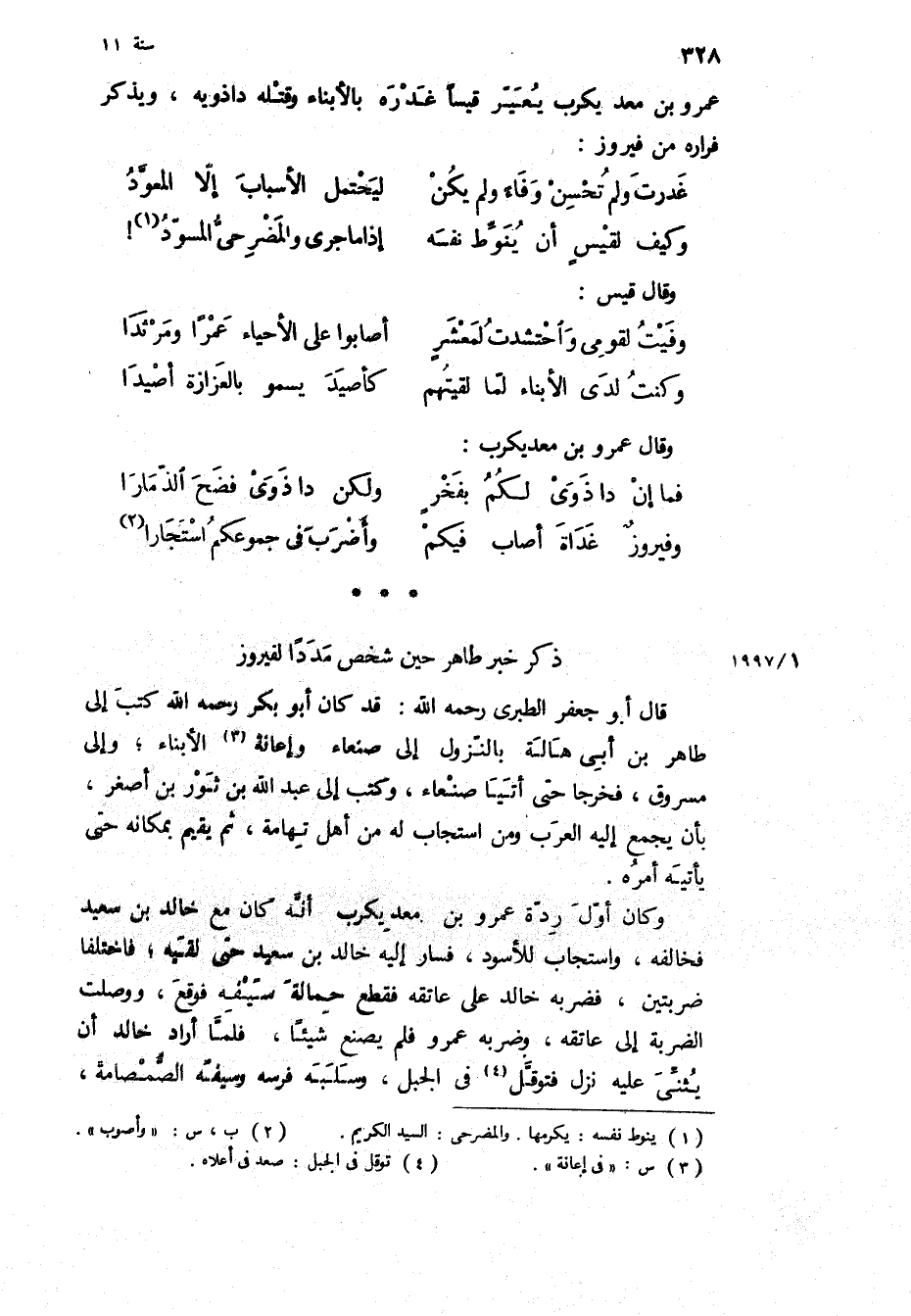 عمرو بْن معديكرب يعير قيسا غدره بالأبناء وقتله داذويه، ويذكر فراره من فيروز: