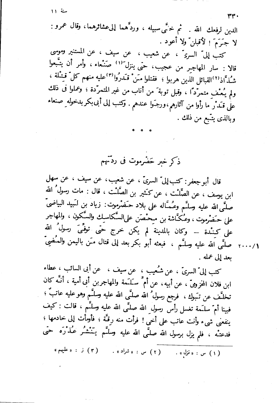 قَالَ أَبُو جَعْفَرٍ: كَتَبَ إِلَيَّ السَّرِيُّ، عَنْ شعيب، عن سيف، عن سهل ابن يُوسُفَ، عَنِ الصَّلْتِ، عَنْ كَثِيرِ بْنِ الصَّلْتِ، قال: مات رسول الله ص وَعُمَّالُهُ عَلَى بِلادِ حَضْرَمَوْتَ: زِيَادُ بْنُ لَبِيدٍ الْبَيَاضِيُّ عَلَى حَضْرَمَوْتَ وَعُكَّاشَةُ بنُ مِحْصَنٍ عَلَى السَّكَاسِكِ وَالسّكُونِ، وَالْمُهَاجِرُ عَلَى كِنْدَةَ- وَكَانَ بِالْمَدِينَةِ لَمْ يَكُنْ خَرَجَ حَتَّى تُوُفِّيَ رَسُولُ اللَّهِ ص، فَبَعَثَهُ أَبُو بَكْرٍ بَعْدُ إِلَى قِتَالِ مَنْ بِالْيَمَنِ وَالْمُضِيِّ بَعْدُ إِلَى عَمَلِهِ.