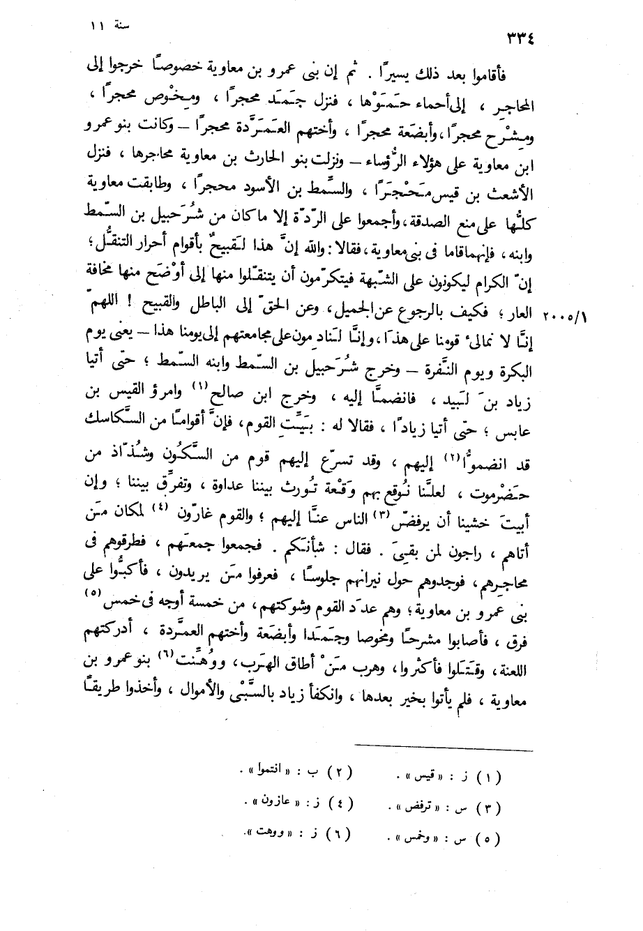 فأقاموا بعد ذلك يسيرا ثم إن بني عمرو بْن معاوية خصوصا خرجوا إلى المحاجر، إلى أحماء حموها، فنزل جمد محجرا، ومخوص محجرا، ومشرح محجرا، وأبضعة محجرا، وأختهم العمردة محجرا- وكانت بنو عمرو ابن معاوية على هؤلاء الرؤساء- ونزلت بنو الحارث بْن معاوية محاجرها، فنزل الأشعث بْن قيس محجرا، والسمط بْن الأسود محجرا، وطابقت معاوية كلها على منع الصدقة، وأجمعوا على الردة إلا ما كان من شرحبيل بْن السمط وابنه، فإنهما قاما في بني معاوية، فقالا: والله إن هذا لقبيح بأقوام أحرار التنقل، إن الكرام ليكونون على الشبهة فيتكرمون أن يتنقلوا منها إلى أوضح منها مخافة العار، فكيف بالرجوع عن الجميل، وعن الحق إلى الباطل والقبيح! اللهم انا لا نمالى قومنا على هذا، وإنا لنادمون على مجامعتهم إلى يومنا هذا- يعني يوم البكرة ويوم النفره- وخرج شرحبيل بْن السمط وابنه السمط، حتى أتيا زياد بْن لبيد، فانضما إليه، وخرج ابن صالح وامرؤ القيس بْن عابس، حتى أتيا زيادا، فقالا له: بيت القوم، فإن أقواما من السكاسك قد انضموا إليهم، وقد تسرع إليهم قوم من السكون وشذاذ من حضرموت، لعلنا نوقع بهم وقعة تورث بيننا عداوة، وتفرق بيننا، وإن أبيت خشينا أن يرفضَّ الناس عنا إليهم، والقوم غارون لمكان من أتاهم، راجون لمن بقي فقال: شأنكم فجمعوا جمعهم، فطرقوهم في محاجرهم، فوجدوهم حول نيرانهم جلوسا، فعرفوا من يريدون، فأكبوا على بني عمرو بْن معاوية، وهم عدد القوم وشوكتهم، من خمسة أوجه في خمس فرق، فأصابوا مشرحا ومخوصا وجمدا وأبضعة وأختهم العمردة، أدركتهم اللعنة، وقتلوا فأكثروا، وهرب من أطاق الهرب، ووهنت بنو عمرو بْن معاوية، فلم يأتوا بخير بعدها، وانكفأ زياد بالسبي والأموال، وأخذوا طريقا