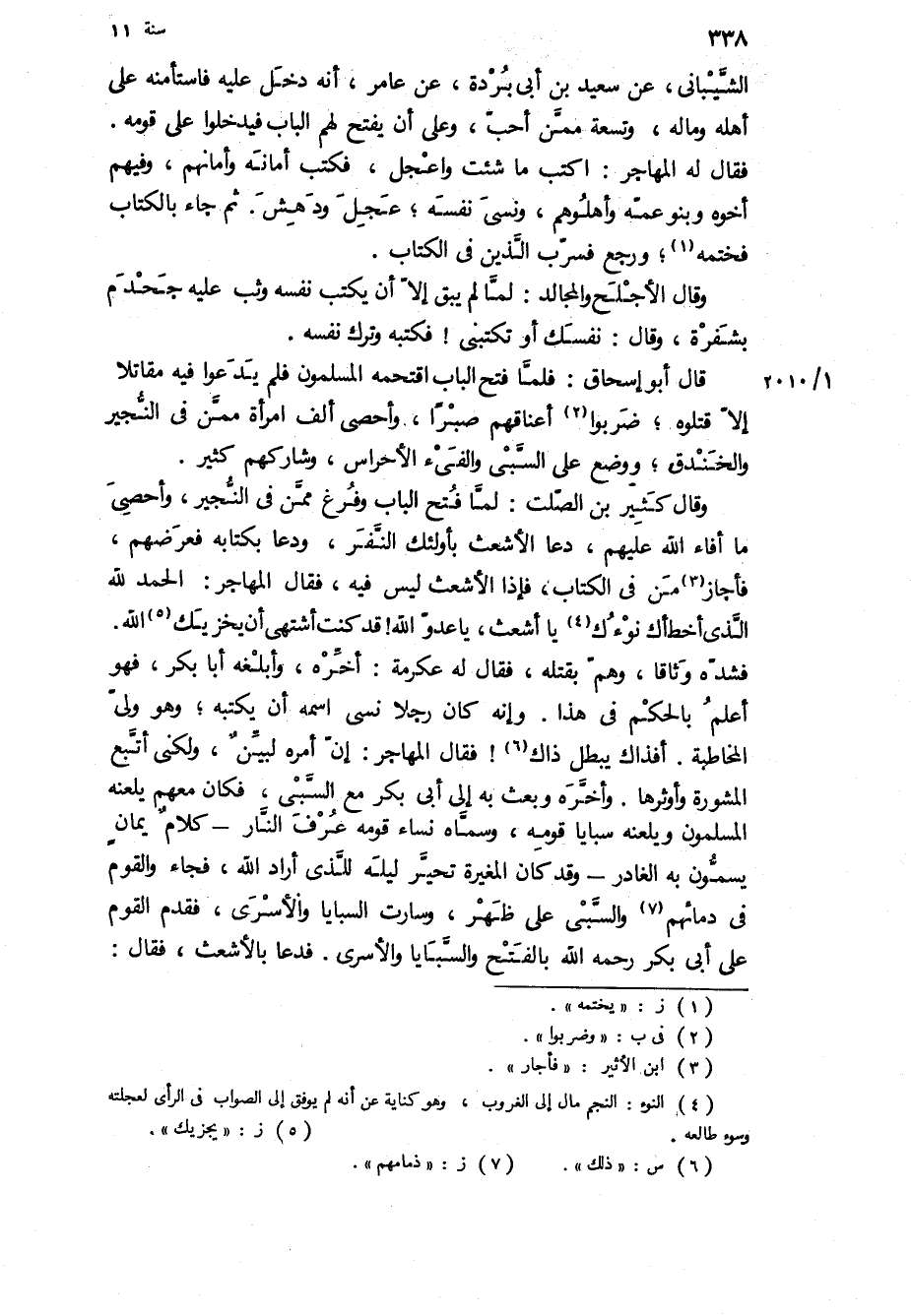 وقال كثير بْن الصلت: لما فتح الباب وفُرغ ممن في النجير، وأحصي ما أفاء اللَّه عليهم، دعا الأشعث بأولئك النفر، ودعا بكتابه فعرضهم، فأجاز من في الكتاب، فإذا الأشعث ليس فيه، فقال المهاجر: الحمد لله الذي أخطاك نوءك يا أشعث، يا عدو اللَّه! قد كنت أشتهي أن يخزيك اللَّه.