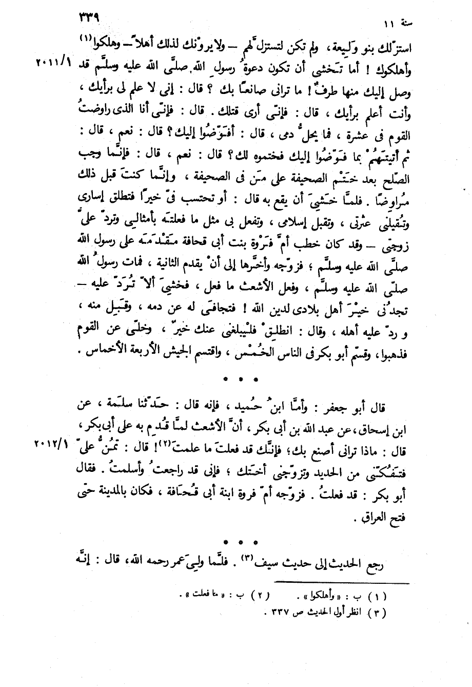 رَجَعَ الْحَدِيثُ إِلَى حَدِيثِ سَيْفٍ فَلَمَّا وَلِيَ عُمَرُ رَحِمَهُ اللَّهُ، قَالَ: انه