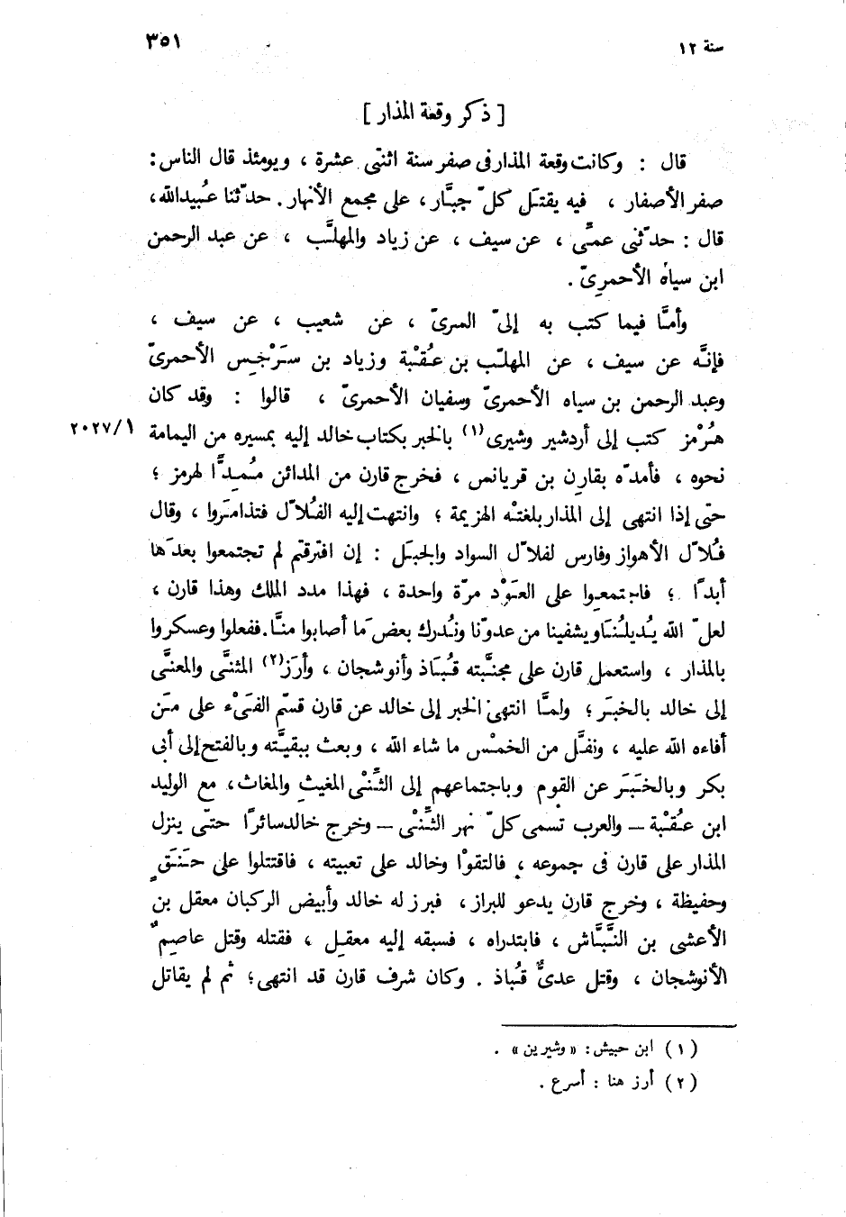 وَأَمَّا فِيمَا كَتَبَ بِهِ إِلَيَّ السَّرِيُّ، عَنْ شُعَيْبٍ، عَنْ سَيْفٍ، فَإِنَّهُ عَنْ سيف، عن المهلب بن عقبة وزياد بن سَرْجِسَ الأَحْمَرِيِّ وَعَبْدِ الرَّحْمَنِ بْنِ سِيَاهٍ الأَحْمَرِيِّ وَسُفْيَانَ الأَحْمَرِيِّ، قَالُوا: وَقَدْ كَانَ هُرْمُزُ كَتَبَ إِلَى أَرْدَشِيرَ وَشِيرَى بِالْخَبَرِ بِكِتَابِ خَالِدٍ إِلَيْهِ بِمَسِيرِهِ مِنَ الْيَمَامَةِ نَحْوَهُ، فَأَمَدَّهُ بِقَارِنِ بْنِ قريانسَ، فَخَرَجَ قَارِنٌ مِنَ الْمَدَائِنِ مُمِدًّا لِهُرْمُزَ، حَتَّى إِذَا انْتَهَى إِلَى الْمذارِ بَلَغَتْهُ الْهَزِيمَةُ، وَانْتَهَتْ إِلَيْهِ الْفُلالُ فَتَذَامَرُوا، وَقَالَ فُلَّالُ الأَهْوَازِ وَفَارِسَ لِفُلالِ السَّوَادِ وَالْجَبَلِ: إِنِ افْتَرَقْتُمْ لَمْ تَجْتَمِعُوا بَعْدَهَا أَبَدًا، فَاجْتَمَعُوا عَلَى الْعَوْدِ مَرَّةً وَاحِدَةً، فَهَذَا مَدَدُ الْمَلِكِ وَهَذَا قَارِنٌ، لَعَلَّ اللَّهَ يُديلنَا وَيُشْفِينَا مِنْ عَدُوِّنَا وَنُدْرِكُ بَعْضَ مَا أَصَابُوا مِنَّا فَفَعَلُوا وَعَسْكَرُوا بِالمذارِ، وَاسْتَعْمَلَ قَارِنٌ عَلَى مُجَنِّبَتِهِ قُبَاذُ وَأَنُوشَجَانُ، وَأَرَزَ الْمُثَنَّى وَالْمُعَنَّى إِلَى خَالِدٍ بِالْخَبَرِ، وَلَمَّا انْتَهَى الْخَبَرُ إِلَى خَالِدٍ عَنْ قَارِنٍ قَسَّمَ الْفَيْءَ عَلَى مَنْ أَفَاءَهُ اللَّهُ عَلَيْهِ، وَنَفَّلَ مِنَ الْخُمسِ مَا شَاءَ اللَّهُ، وَبَعَثَ بِبَقِيَّتِهِ وَبِالْفَتْحِ إِلَى أَبِي بَكْرٍ وَبِالْخَبَرِ عَنِ الْقَوْمِ وَبِاجْتِمَاعِهِمْ إِلَى الثني المغيث والمغاث، مع الوليد ابن عُقْبَةَ- وَالْعَرَبُ تُسَمِّي كُلَّ نَهْرٍ الثّنِيَّ- وَخَرَجَ خَالِدٌ سَائِرًا حَتَّى يَنْزِلَ الْمذارَ عَلَى قَارِنٍ فِي جُمُوعِهِ، فَالْتَقَوْا وَخَالِدٌ عَلَى تَعْبِيَتِهِ، فَاقْتَتَلُوا عَلَى حَنَقٍ وَحَفِيظَةٍ، وَخَرَجَ قَارِنٌ يَدْعُو لِلْبِرَازِ، فَبَرَزَ لَهُ خَالِدٌ وَأَبْيَضُ الرُّكْبَانِ مَعْقِلُ بْنُ الأَعْشَى بْنِ النَّبَّاشِ، فَابْتَدَرَاهُ، فَسَبَقَهُ إِلَيْهِ مَعْقِلٌ، فَقَتَلَهُ وَقَتَلَ عَاصِمٌ الأَنُوشَجَانَ، وَقَتَلَ عَدِيُّ قُبَاذَ وَكَانَ شَرَفُ قَارِنٍ قَدِ انْتَهَى، ثَمَّ لَمْ يقاتل