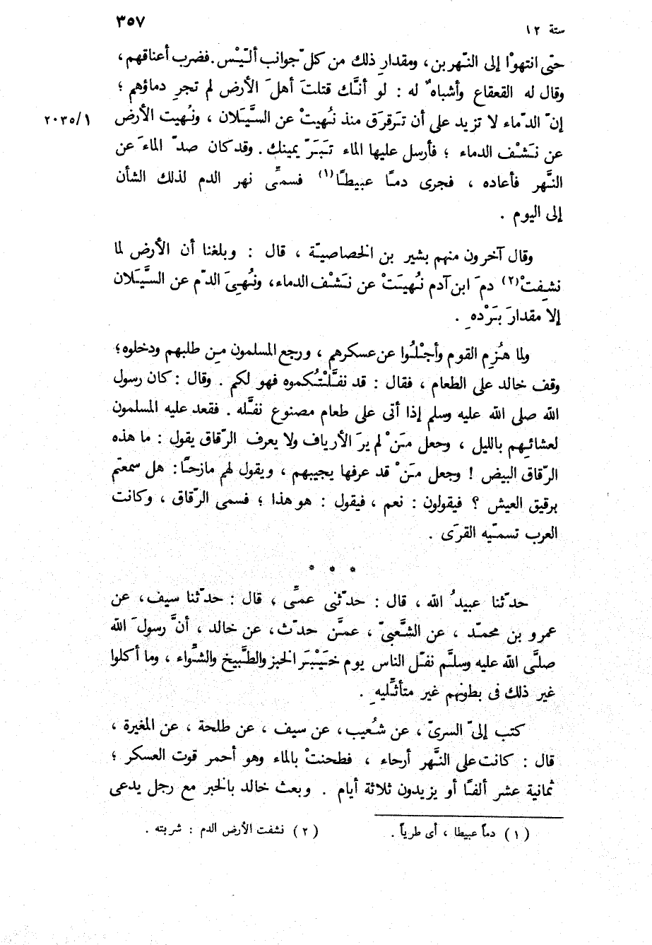 حَتَّى انْتَهَوْا إِلَى النَّهْرَيْنِ، وَمِقْدَارِ ذَلِكَ مِنْ كُلِّ جَوَانِبِ أُلَيْسَ فَضَرَبَ أَعْنَاقَهُمْ، وَقَالَ لَهُ الْقَعْقَاعُ وَأَشْبَاهٌ لَهُ: لَوْ أَنَّكَ قَتَلْتَ أَهْلَ الأَرْضِ لَمْ تَجْرِ دِمَاؤُهُمْ، إِنَّ الدِّمَاءَ لا تَزِيدُ عَلَى أَنْ تَرَقْرَقَ مُنْذُ نَهَيْتَ عَنِ السَّيَلانِ، وَنُهِيَتِ الأَرْضُ عَنْ نَشْفِ الدِّمَاءِ، فَأَرْسِلْ عَلَيْهَا، الْمَاءَ تَبَرَّ يَمِينُكَ وَقَدْ كَانَ صَدَّ الْمَاءَ عَنِ النَّهْرِ فَأَعَادَهُ، فَجَرَى دَمًا عَبِيطًا فَسُمِّيَ نَهْرَ الدَّمِ لِذَلِكَ الشَّأْنِ إِلَى الْيَوْمِ وَقَالَ آخَرُونَ مِنْهُمْ بَشِيرُ بْنُ الْخَصَّاصِيَّةِ، قَالَ: وَبَلَغَنَا أَنَّ الأَرْضَ لَمَّا نَشَّفَتْ دَمَ ابْنِ آدَمَ نُهِيَتْ عَنْ نَشْفِ الدِّمَاءِ، وَنُهِيَ الدَّمُ عَنِ السَّيَلانِ إِلا مِقْدَارَ برْدِهِ.