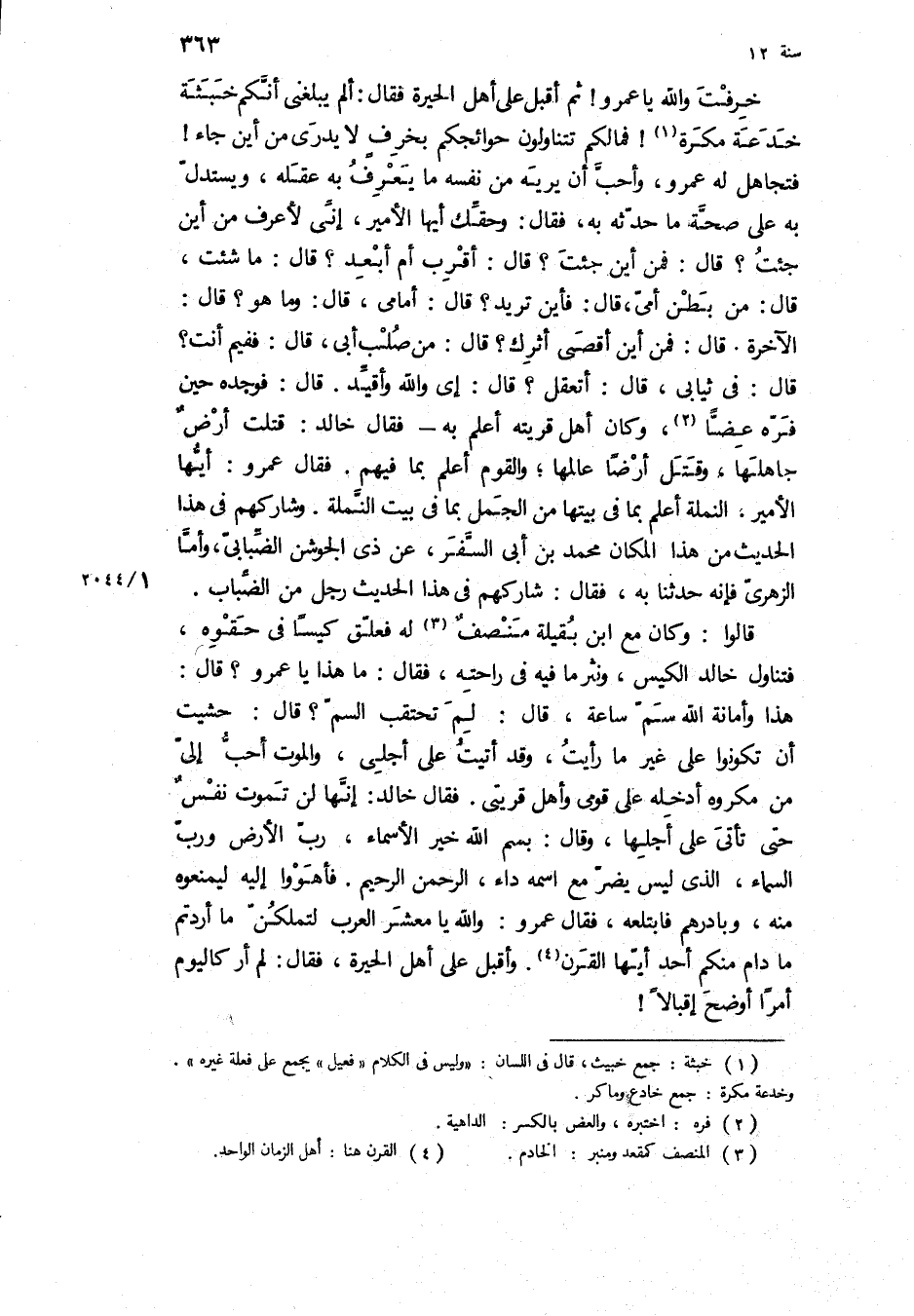 خَرِفْتَ وَاللَّهِ يَا عَمْرُو! ثُمَّ أَقْبَلَ عَلَى أَهْلِ الْحِيرَةِ فَقَالَ: أَلَمْ يَبْلُغْنِي أَنَّكُمْ خَبَثَةٌ خَدَعَةٌ مَكَرَةٌ! فَمَا لَكُمْ تَتَنَاوَلُونَ حَوَائِجَكُمْ بِخَرِفٍ لا يُدْرَى مِنْ أَيْنَ جَاءَ! فَتَجَاهَلَ لَهُ عَمْرٌو، وَأَحَبَّ أَنْ يُرِيَهُ مِنْ نَفْسِهِ مَا يَعْرِفُ بِهِ عَقْلُهُ، وَيَسْتَدِلُّ بِهِ عَلَى صِحَّةِ مَا حَدَّثَهُ بِهِ، فَقَالَ: وَحَقِّكَ أَيُّهَا الأَمِيرُ، إِنِّي لأَعْرِفُ مِنْ أَيْنَ جِئْتُ؟ قَالَ: فَمِنْ أَيْنَ جِئْتَ؟ قَالَ: أَقْرَبُ أَمْ أَبْعَدُ؟ قَالَ: مَا شِئْتَ، قَالَ: مِنْ بَطْنِ أُمِّي، قَالَ: فَأَيْنَ تُرِيدُ؟ قَالَ: أَمَامِي، قَالَ: وَمَا هُوَ؟ قَالَ: