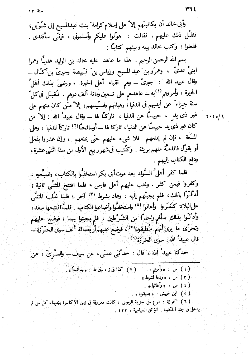 بِسْمِ اللَّهِ الرَّحْمَنِ الرَّحِيمِ هَذَا مَا عَاهَدَ عَلَيْهِ خَالِدُ بْنُ الْوَلِيدِ عَدِيًّا وَعَمْرًا ابْنَيْ عَدِيٍّ، وَعَمْرَو بْنَ عَبْدِ الْمَسِيحِ وَإِيَاسَ بْنِ قَبِيصَةَ وَحيريَّ بْنِ أَكَّالٍ- وَقَالَ عُبَيْدُ اللَّهِ: جبرى- وَهُمْ نُقَبَاءُ أَهْلِ الْحِيرَةِ، وَرَضِيَ بِذَلِكَ أَهْلُ الْحِيرَةِ، وَأَمَرُوهُمْ بِهِ- عَاهَدَهُمْ عَلَى تِسْعِينَ وَمِائَةِ أَلْفِ دِرْهَمٍ، تُقْبَلُ فِي كُلِّ سَنَةٍ جَزَاءً عَنْ أَيْدِيهِمْ فِي الدُّنْيَا، رُهْبَانِهِمْ وَقِسِّيسِهِمْ، إِلا مَنْ كَانَ مِنْهُمْ عَلَى غَيْرِ ذِي يَدٍ، حَبِيسًا عَنِ الدُّنْيَا، تَارِكًا لَهَا- وَقَالَ عُبَيْدُ اللَّهِ: إِلا مَنْ كَانَ غَيْرَ ذِي يَدٍ حَبِيسًا عَنِ الدُّنْيَا، تَارِكًا لَهَا- أَوْ سَائِحًا تَارِكًا لِلدُّنْيَا، وَعَلَى الْمَنْعَةِ، فَإِنْ لَمْ يَمْنَعْهُمْ فَلا شَيْءَ عَلَيْهِمْ حَتَّى يَمْنَعَهُمْ، وَإِنْ غَدَرُوا بِفِعْلٍ أَوْ بِقَوْلٍ فَالذِّمَّةُ مِنْهُمْ بَرِيئَةٌ وَكَتَبَ فِي شَهْرِ رَبِيعٍ الأَوَّلِ مِنْ سَنَةِ اثْنَتَيْ عَشْرَةَ، وَدَفَعَ الْكِتَابَ إِلَيْهِمْ.
