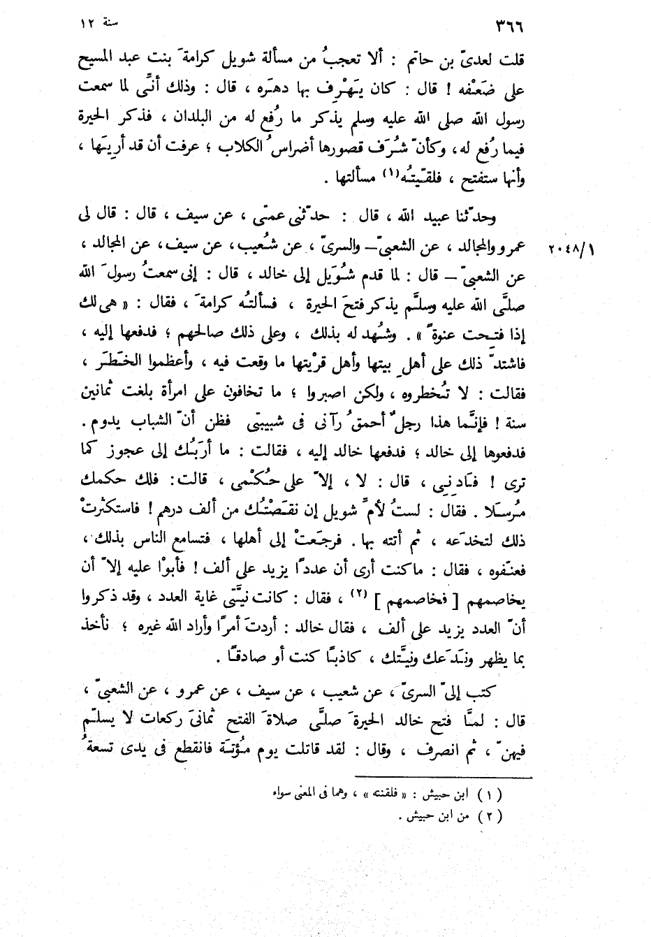 وَحدثنا عُبَيْدُ اللَّهِ، قَالَ: حَدَّثَنِي عَمِّي، عَنْ سَيْفٍ، قال: قَالَ لِي عَمْرٌو وَالْمُجَالِدُ، عَنِ الشَّعْبِيِّ- وَالسَّرِيِّ، عَنْ شُعَيْبٍ، عَنْ سَيْفٍ، عَنِ الْمُجَالِدِ، عَنِ الشَّعْبِيِّ- قَالَ: [لَمَّا قَدِمَ شُوَيْلٌ إِلَى خَالِدٍ، قَالَ: إِنِّي سَمِعْتُ رَسُولَ الله ص يَذْكُرُ فَتْحَ الْحِيرَةَ، فَسَأَلْتُهُ كَرَامَةً، فَقَالَ: هِيَ لَكَ إِذَا فُتِحَتْ عَنْوَةً] وَشَهِدَ لَهُ بِذَلِكَ، وَعَلَى ذَلِكَ صَالَحَهُمْ، فَدَفَعَهَا إِلَيْهِ، فَاشْتَدَّ ذَلِكَ عَلَى أَهْلِ بَيْتِهَا وَأَهْلِ قَرْيَتِهَا مَا وَقَعَتْ فِيهِ، وَأَعْظَمُوا الْخَطَرَ، فَقَالَتْ: لا تَخْطُرُوهُ، وَلَكِنِ اصْبِرُوا، مَا تَخَافُونَ عَلَى امْرَأَةٍ بَلَغَتْ ثَمَانِينَ سَنَةً! فَإِنَّمَا هَذَا رَجُلٌ أَحْمَقُ رَآنِي فِي شَبِيبَتِي فَظَنَّ أَنَّ الشَّبَابَ يَدُومُ.