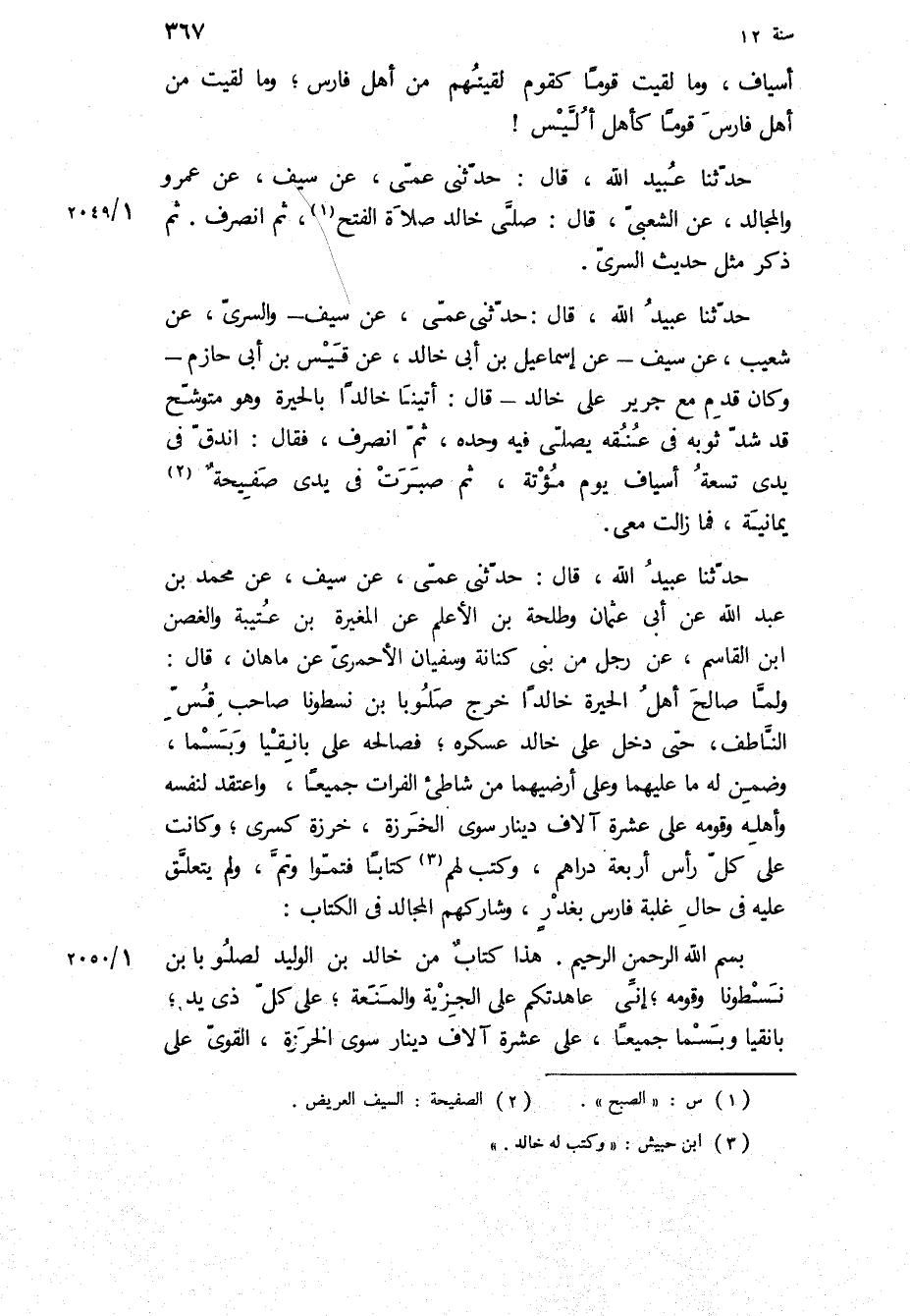 حدثنا عبيد الله، قال: حدثني عمي، عن سيف- والسري، عَنْ شُعَيْبٍ، عَنْ سَيْفٍ- عَنْ إِسْمَاعِيلَ بْنِ أَبِي خَالِدٍ، عَنْ قَيْسِ بْنِ أَبِي حَازِمٍ- وَكَانَ قَدِمَ مَعَ جَرِيرٍ عَلَى خَالِدٍ- قَالَ: أَتَيْنَا خَالِدًا بِالْحِيرَةِ وَهُوَ مُتَوَشِّحٌ قَدْ شَدَّ ثَوْبَهُ فِي عُنُقِهِ يُصَلِّي فِيهِ وَحْدَهُ، ثُمَّ انْصَرَفَ، فَقَالَ: انْدَقَّ فِي يَدِي تِسْعَةُ أَسْيَافٍ يَوْمَ مُؤْتَةَ، ثُمَّ صَبَرَتْ فِي يَدِي صَفِيحَةٌ يَمَانِيَّةٌ، فَمَا زَالَتْ مَعِي.