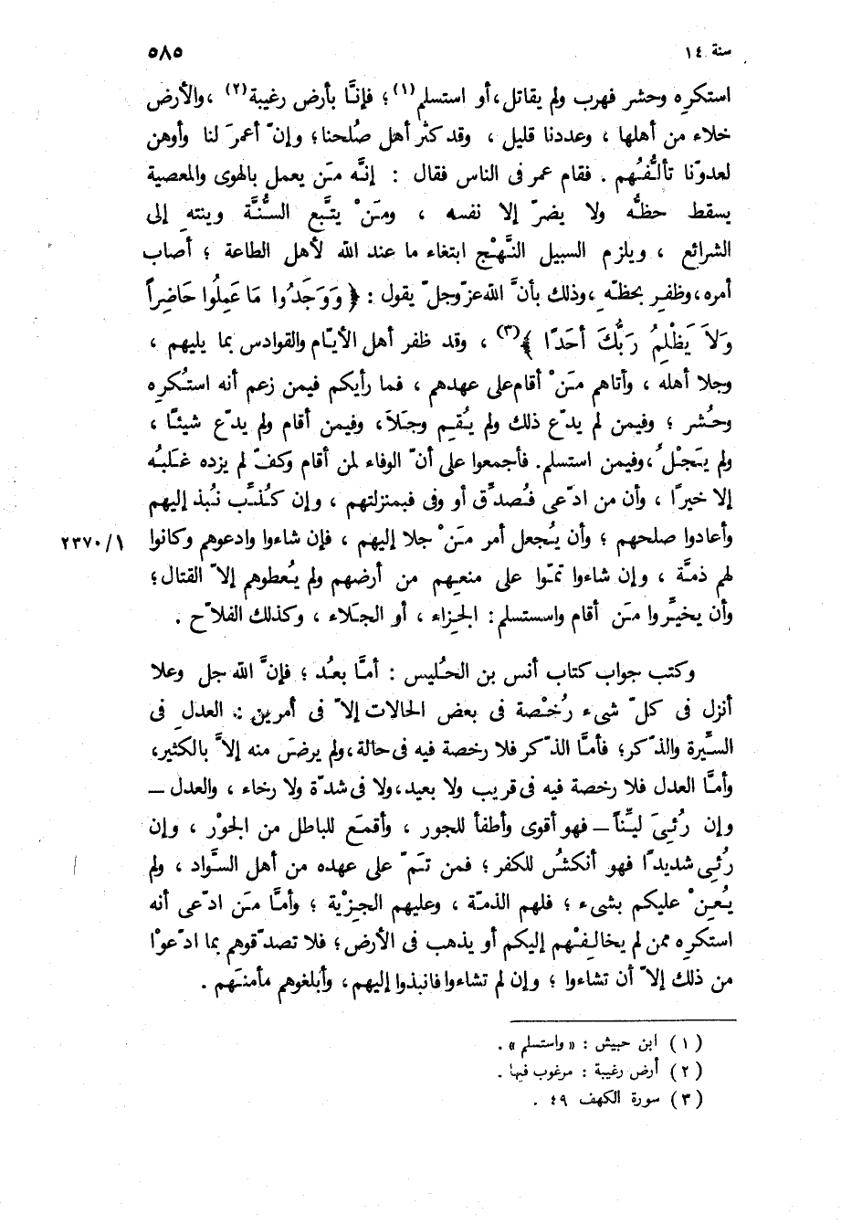 اسْتُكْرِهَ وَحُشِرَ فَهَرَبَ وَلَمْ يُقَاتِلْ، أَوِ اسْتَسْلَمَ، فَإِنَّا بِأَرْضٍ رغيبة، وَالأَرْضُ خَلاءٌ مِنْ أَهْلِهَا، وَعَدَدُنَا قَلِيلٌ، وَقَدْ كَثُرَ أَهْلُ صلحنَا، وَإِنْ أَعْمَرَ لَنَا وَأَوْهَنَ لِعدونا تألفهم فَقَامَ عُمَرُ فِي النَّاسِ فَقَالَ: إِنَّهُ مَنْ يَعْمَلْ بِالْهَوَى وَالْمَعْصِيَةِ يَسْقُطْ حَظُّهُ وَلا يَضُرَّ إِلا نَفْسَهُ، وَمَنْ يَتَّبِعِ السُّنَّةَ وَيَنْتَهِ إِلَى الشَّرَائِعِ، وَيَلْزَمِ السَّبِيلَ النَّهجَ ابْتِغَاءَ مَا عِنْدِ اللَّهِ لأَهْلِ الطَّاعَةِ، أَصَابَ أَمْرَهُ، وَظَفَرَ بِحَظِّهِ، وَذَلِكَ بِأَنَّ اللَّهَ عَزَّ وَجَلَّ يَقُولُ: «وَوَجَدُوا مَا عَمِلُوا حاضِراً وَلا يَظْلِمُ رَبُّكَ أَحَداً» ، وَقَدْ ظَفَرَ أَهْلُ الأَيَّامِ وَالْقَوَادِسِ بِمَا يَلِيهِمْ، وَجَلا أَهْلُهُ، وَأَتَاهُمْ مَنْ أَقَامَ عَلَى عَهْدِهِمْ، فَمَا رَأْيُكُمْ فِيمَنْ زَعَمَ أَنَّهُ اسْتُكْرِهَ وَحُشِرَ، وَفِيمَنْ لَمْ يَدع ذَلِكَ وَلَمْ يَقُمْ وَجِلا، وفيمن أقام ولم يدع شيئا، ولم يجل، وفيمن استسلم فأجمعوا على أن الوفاء لمن أقام وكف لم يزده غلبه إلا خيرا، وأن من ادعى فصدق أو وفي فبمنزلتهم، وإن كذب نبذ إليهم وأعادوا صلحهم، وأن يجعل أمر من جلا إليهم، فإن شاءوا وادعوهم وكانوا لهم ذمة، وإن شاءوا تموا على منعهم من أرضهم ولم يعطوهم إلا القتال، وأن يخيروا من أقام واستسلم: الجزاء، أو الجلاء، وكذلك الفلاح.
