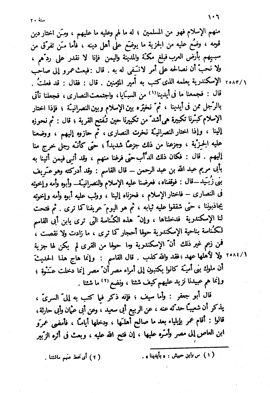 قال: فجمعنا ما في أيدينا من السبايا، واجتمعت النصارى، فجعلنا نأتي بالرجل ممن في أيدينا، ثم نخيره بين الإسلام وبين النصرانية، فإذا اختار الإسلام كبرنا تكبيرة هي أشد من تكبيرنا حين تفتح القرية، قال: ثم نحوزه إلينا، وإذا اختار النصرانية نخرت النصارى، ثم حازوه إليهم، ووضعنا عليه الجزية، وجزعنا من ذلك جزعا شديدا، حتى كأنه رجل خرج منا إليهم قال: فكان ذلك الدأب حتى فرغنا منهم، وقد أتي فيمن أتينا به بأبي مريم عبد اللَّه بْن عبد الرحمن- قال القاسم: وقد أدركته وهو عريف بني زبيد- قال: فوقفناه، فعرضنا عليه الإسلام والنصرانية- وأبوه وأمه وإخوته في النصارى- فاختار الإسلام، فحزناه إلينا، ووثب عليه أبوه وأمه وإخوته يجاذبوننا، حتى شققوا عليه ثيابه، ثم هو اليوم عريفنا كما ترى ثم فتحت لنا الإسكندرية فدخلناها، وإن هذه الكناسة التي ترى يا بن أبي القاسم لكناسة بناحية الإسكندرية حولها أحجار كما ترى، ما زادت ولا نقصت، فمن زعم غير ذلك أن الإسكندرية وما حولها من القرى لم يكن لها جزية ولا لأهلها عهد، فقد والله كذب قال القاسم: وإنما هاج هذا الحديث أن ملوك بني أمية كانوا يكتبون إلى أمراء مصر أن مصر إنما دخلت عنوة، وإنما هم عبيدنا نزيد عليهم كيف شئنا، ونضع ما شئنا.