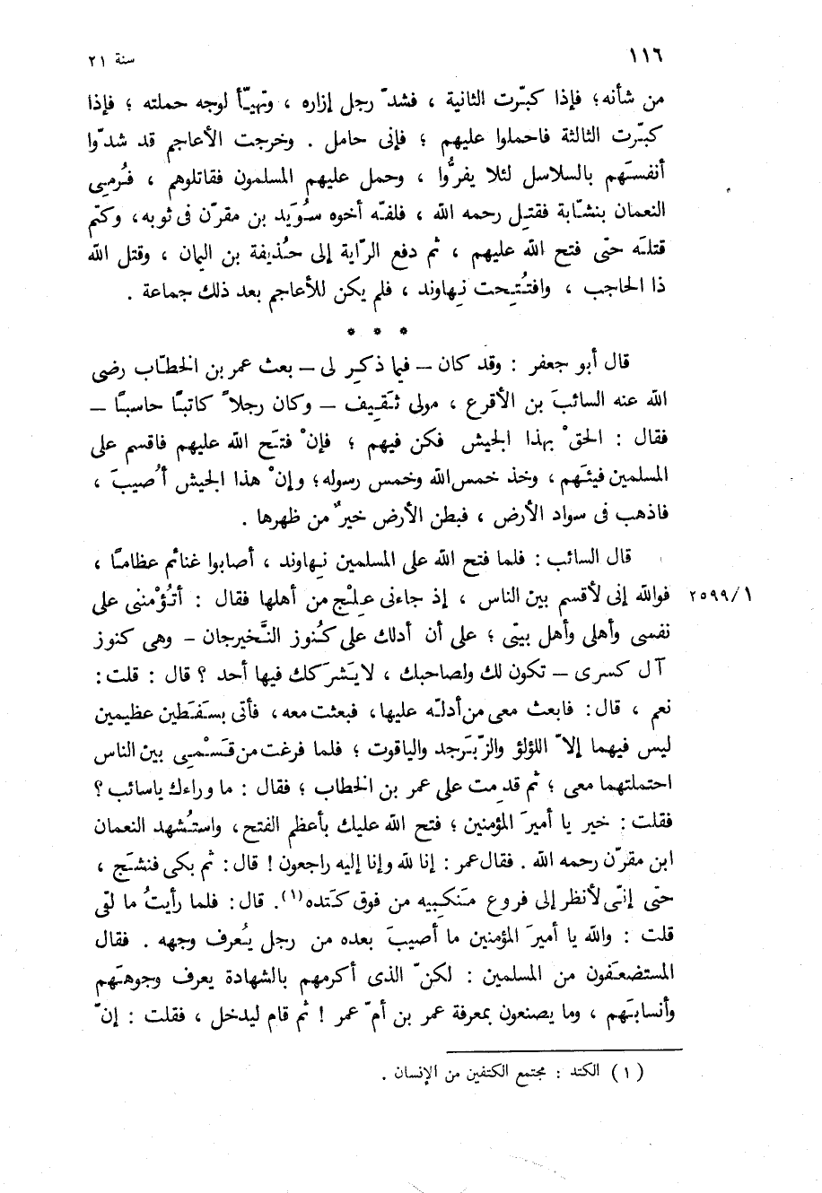 من شأنه، فإذا كبرت الثانية، فشد رجل إزاره، وتهيأ لوجه حملته، فإذا كبرت الثالثة فاحملوا عليهم، فإني حامل وخرجت الأعاجم قد شدوا أنفسهم بالسلاسل لئلا يفروا، وحمل عليهم المسلمون فقاتلوهم، فرمي النعمان بنشابة فقتل رحمه اللَّه، فلفه أخوه سويد بْن مقرن في ثوبه، وكتم قتله حتى فتح اللَّه عليهم، ثم دفع الراية إلى حذيفة بْن اليمان، وقتل اللَّه ذا الحاجب، وافتتحت نهاوند، فلم يكن للأعاجم بعد ذلك جماعة.
