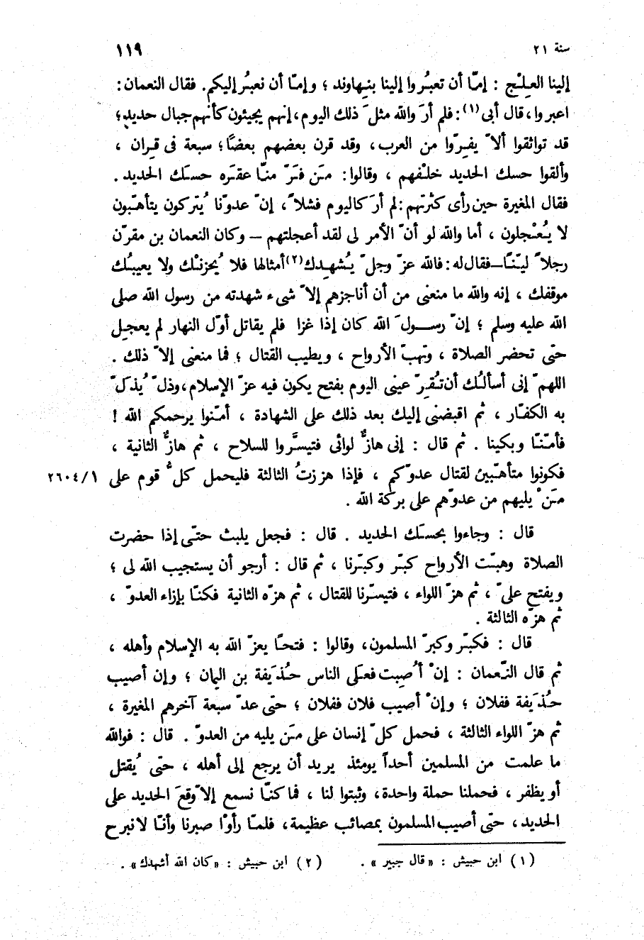 قَالَ: فَكَبَّرَ وَكَبَّرَ الْمُسْلِمُونَ، وَقَالُوا: فَتْحًا يُعِزُّ اللَّهُ بِهِ الإِسْلامَ وَأَهْلَهُ، ثُمَّ قَالَ النُّعْمَانُ: إِنْ أُصِبْتُ فَعَلَى النَّاسِ حُذَيْفَةُ بْنُ الْيَمَانِ، وَإِنْ أُصِيبَ حُذَيْفَةُ فَفُلانٌ، وَإِنْ أُصِيبَ فُلانٌ فَفُلانٌ، حَتَّى عَدَّ سَبْعَةً آخِرُهُمُ الْمُغِيرَةُ، ثُمَّ هَزَّ اللِّوَاءَ الثَّالِثَةَ، فَحَمَلَ كُلُّ إِنْسَانٌ عَلَى مَنْ يَلِيهِ من العدو قال: فو الله مَا عَلِمْتُ مِنَ الْمُسْلِمِينَ أَحَدًا يَوْمَئِذٍ يُرِيدُ أَنْ يَرْجِعَ إِلَى أَهْلِهِ، حَتَّى يُقْتَلَ أَوْ يَظْفُرَ، فَحَمَلْنَا حَمْلَةً وَاحِدَةً، وَثَبَتُوا لَنَا، فَما كُنَّا نَسْمَعُ إِلا وَقْعَ الْحَدِيدِ عَلَى الْحَدِيدِ، حَتَّى أُصِيبَ الْمُسْلِمُونَ بِمَصَائِبَ عَظِيمَةٍ، فَلَمَّا رَأَوْا صَبْرَنَا وَأَنَّا لا نَبْرَحُ
