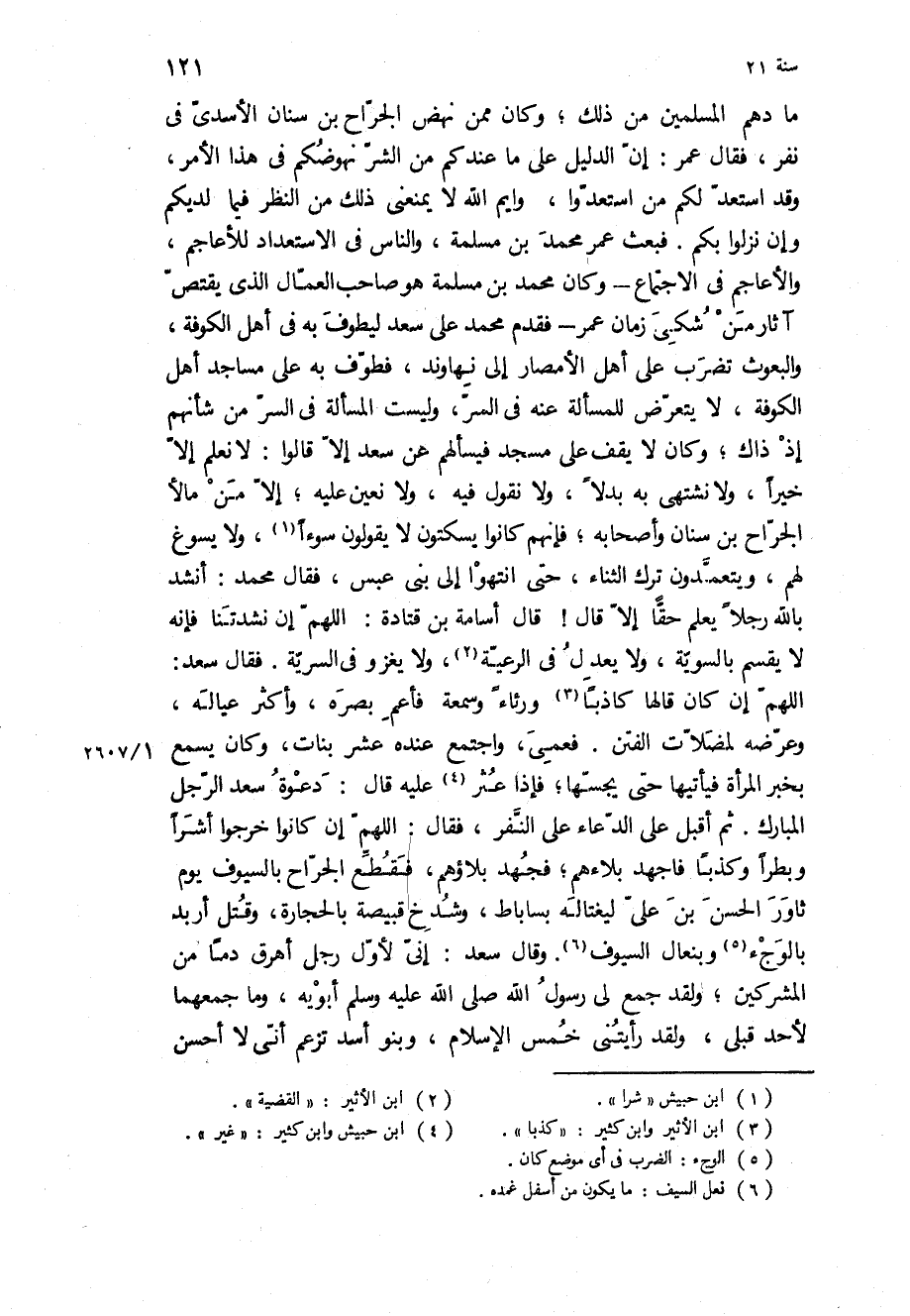 ما دهم المسلمين من ذلك، وكان ممن نهض الجراح بْن سنان الأسدي في نفر، فقال عمر: إن الدليل على ما عندكم من الشر نهوضكم في هذا الأمر، وقد استعد لكم من استعدوا، وايم اللَّه لا يمنعني ذلك من النظر فيما لديكم وإن نزلوا بكم فبعث عمر مُحَمَّد بْن مسلمة، والناس في الاستعداد للأعاجم، والأعاجم في الاجتماع- وكان مُحَمَّد بْن مسلمة هو صاحب العمال الذي يقتص آثار من شكى زمان عمر- فقدم مُحَمَّد على سعد ليطوف به في أهل الكوفة، والبعوث تضرب على أهل الأمصار إلى نهاوند، فطوف به على مساجد أهل الكوفة، لا يتعرض للمسألة عنه في السر، وليست المسألة في السر من شأنهم إذ ذاك، وكان لا يقف على مسجد فيسألهم عن سعد إلا قالوا: لا نعلم إلا خيرا، ولا نشتهي به بدلا، ولا نقول فيه، ولا نعين عليه، إلا من مالأ الجراح بْن سنان وأصحابه، فإنهم كانوا يسكتون لا يقولون سوءا، ولا يسوغ لهم، ويتعمدون ترك الثناء، حتى انتهوا إلى بني عبس، فقال مُحَمَّد: أنشد بالله رجلا يعلم حقا إلا قال! قال أسامة بْن قتادة: اللهم إن نشدتنا فإنه لا يقسم بالسويه، وو لا يعدل في الرعية، ولا يغزو في السرية فقال سعد:
