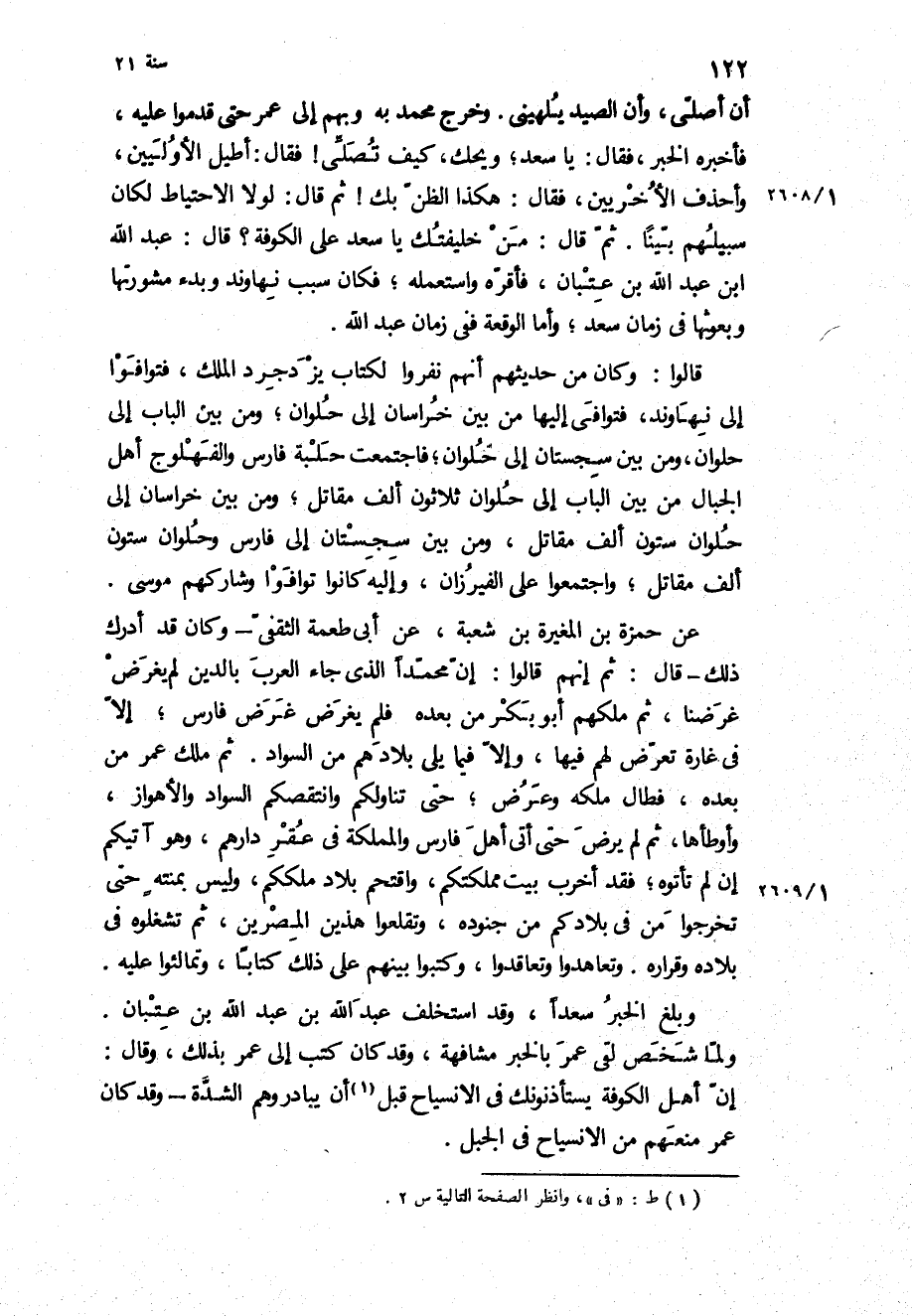 ان أصلي، وأن الصيد يلهيني وخرج مُحَمَّد به وبهم إلى عمر حتى قدموا عليه، فأخبره الخبر، فقال: يا سعد، ويحك، كيف تصلي! فقال: أطيل الأوليين، وأحذف الأخريين، فقال: هكذا الظن بك! ثم قال: لولا الاحتياط لكان سبيلهم بينا ثم قال: من خليفتك يا سعد على الكوفه؟ قال: عبد الله ابن عبد اللَّه بن عتبان، فأقره واستعمله، فكان سبب نهاوند وبدء مشورتها وبعوثها في زمان سعد، وأما الوقعة ففي زمان عبد اللَّه.
