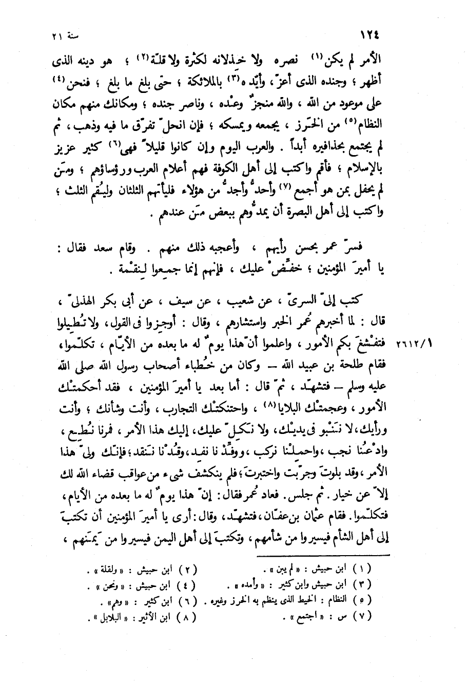 الأمر لم يكن نصره ولا خذلانه لكثرة ولا قلة، هو دينه الذي أظهر، وجنده الذي أعز، وأيده بالملائكة، حتى بلغ ما بلغ، فنحن على موعود من اللَّه، والله منجز وعده، وناصر جنده، ومكانك منهم مكان النظام من الخرز، يجمعه ويمسكه، فإن انحل تفرق ما فيه وذهب، ثم لم يجتمع بحذافيره أبدا والعرب اليوم وإن كانوا قليلا فهي كثير عزيز بالإسلام، فأقم واكتب إلى أهل الكوفة فهم أعلام العرب ورؤساؤهم، ومن لم يحفل بمن هو أجمع وأحد وأجد من هؤلاء فليأتهم الثلثان وليقم الثلث، واكتب إلى أهل البصرة أن يمدوهم ببعض من عندهم] .
