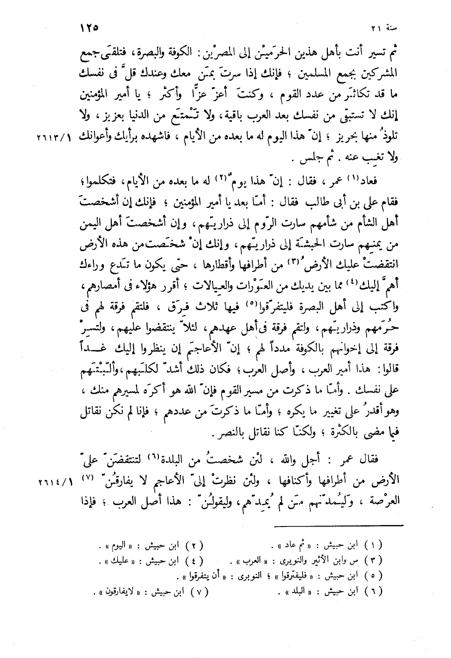فقال عمر: أجل والله، لئن شخصت من البلدة لتنتقضن علي الأرض من أطرافها وأكنافها، ولئن نظرت إلي الأعاجم لا يفارقن العرصة، وليمدنهم من لم يمدهم، وليقولن: هذا أصل العرب، فإذا