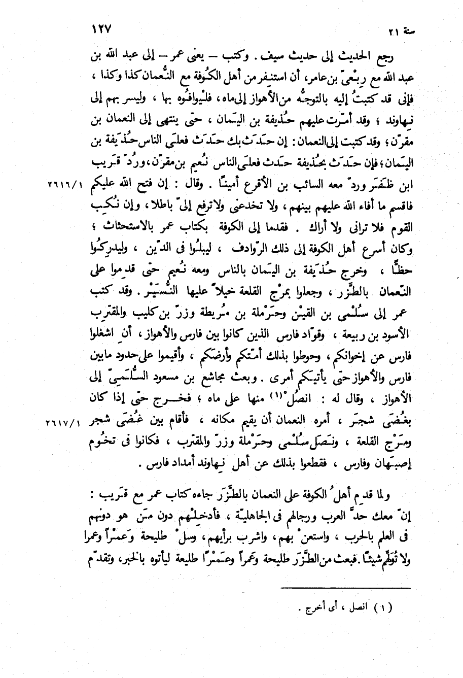 رجع الحديث إلى حديث سيف وكتب- يعني عُمَرُ- إِلَى عَبْدِ اللَّه بْن عَبْدِ اللَّه مع ربعي بْن عامر، أن استنفر من أهل الكوفة مع النعمان كذا وكذا، فإني قد كتبت إليه بالتوجه من الأهواز إلى ماه، فليوافوه بها، وليسر بهم إلى نهاوند، وقد أمرت عليهم حذيفة بْن اليمان، حتى ينتهي إلى النعمان بْن مقرن، وقد كتبت إلى النعمان: إن حدث بك حدث فعلى الناس حذيفة بْن اليمان، فإن حدث بحذيفة حدث فعلى الناس نعيم بْن مقرن، ورد قريب ابن ظفر ورد معه السائب بْن الأقرع أمينا وقال: إن فتح اللَّه عليكم فاقسم ما أفاء اللَّه عليهم بينهم، ولا تخدعني ولا ترفع إلي باطلا، وإن نكب القوم فلا تراني ولا أراك فقدما إلى الكوفة بكتاب عمر بالاستحثاث، وكان أسرع أهل الكوفة إلى ذلك الروادف، ليبلوا في الدين، وليدركوا حظا، وخرج حذيفة بْن اليمان بالناس ومعه نعيم حتى قدموا على النعمان بالطزر، وجعلوا بمرج القلعة خيلا عليها النسير وقد كتب عمر إلى سلمى بْن القين وحرملة بْن مريطة وزر بْن كليب والمقترب الأسود بْن ربيعة، وقواد فارس الذين كانوا بين فارس والأهواز، أن اشغلوا فارس عن إخوانكم، وحوطوا بذلك أمتكم وأرضكم، وأقيموا على حدود ما بين فارس والأهواز حتى يأتيكم أمري وبعث مجاشع بْن مسعود السلمي إلى الأهواز، وقال له: انصل منها على ماه، فخرج حتى إذا كان بغضي شجر، أمره النعمان أن يقيم مكانه، فأقام بين غضي شجر ومرج القلعة، ونصل سلمى وحرملة وزر والمقترب، فكانوا في تخوم إصبهان وفارس، فقطعوا بذلك عن أهل نهاوند أمداد فارس ولما قدم أهل الكوفة على النعمان بالطزر جاءه كتاب عمر مع قريب:
