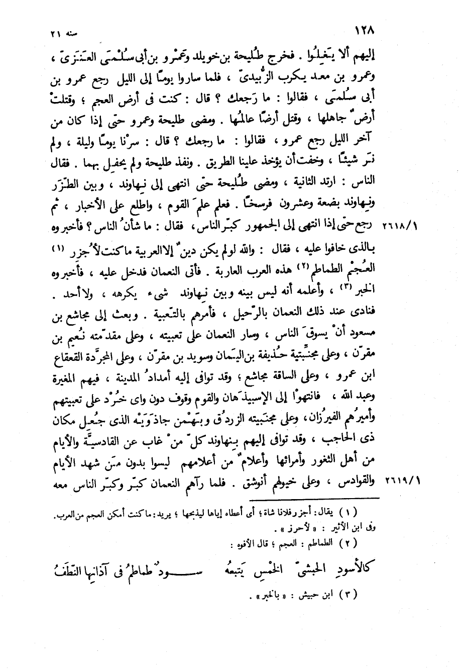 إليهم ألا يغلوا فخرج طليحة بْن خويلد وعمرو بْن أبي سلمى العنزي، وعمرو بْن معد يكرب الزبيدي، فلما ساروا يوما إلى الليل رجع عمرو بْن أبي سلمى، فقالوا: ما رجعك؟ قال: كنت في أرض العجم، وقتلت أرض جاهلها، وقتل أرضا عالمها ومضى طليحة وعمرو حتى إذا كان من آخر الليل رجع عمرو، فقالوا: ما رجعك؟ قال: سرنا يوما وليلة، ولم نر شيئا، وخفت أن يؤخذ علينا الطريق ونفذ طليحة ولم يحفل بهما فقال الناس: ارتد الثانية، ومضى طليحة حتى انتهى إلى نهاوند، وبين الطزر ونهاوند بضعة وعشرون فرسخا فعلم علم القوم، واطلع على الأخبار، ثم رجع حتى إذا انتهى إلى الجمهور كبر الناس، فقال: ما شأن الناس؟ فأخبروه بالذي خافوا عليه، فقال: والله لو لم يكن دين إلا العربية ما كنت لأجزر العجم الطماطم هذه العرب العاربة فأتى النعمان فدخل عليه، فأخبروه الخبر، وأعلمه أنه ليس بينه وبين نهاوند شيء يكرهه، ولا أحد.
