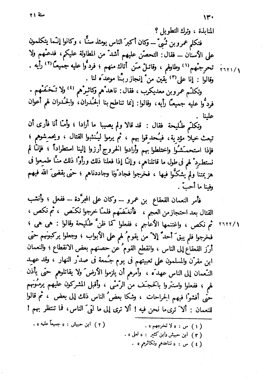 وتكلم طليحة فقال: قد قالا ولم يصيبا ما أرادا، وأما أنا فأرى أن تبعث خيلا مؤدية، فيحدقوا بهم، ثم يرموا لينشبوا القتال، ويحمشوهم، فإذا استحمشوا واختلطوا بهم وأرادوا الخروج أرزوا إلينا استطرادا، فإنا لم نستطرد لهم في طول ما قاتلناهم، وإنا إذا فعلنا ذلك ورأوا ذلك منا طمعوا في هزيمتنا ولم يشكوا فيها، فخرجوا فجادونا وجاددناهم، حتى يقضي اللَّه فيهم وفينا ما أحب.