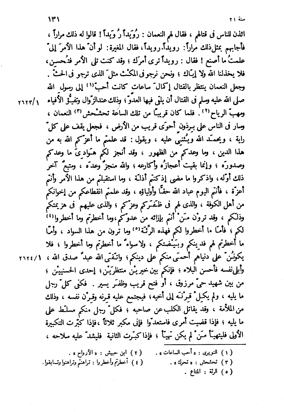 وجعل النعمان ينتظر بالقتال إكمال ساعات كانت أحب إلى رسول اللَّه ص في القتال أن يلقى فيها العدو، وذلك عند الزوال وتفيؤ الأفياء ومهب الرياح فلما كان قريبا من تلك الساعة تحشحش النعمان، وسار في الناس على برذون أحوى قريب من الأرض، فجعل يقف على كل راية، ويحمد اللَّه ويثني عليه، ويقول: قد علمتم ما أعزكم اللَّه به من هذا الدين، وما وعدكم من الظهور، وقد أنجز لكم هوادي ما وعدكم وصدوره، وإنما بقيت أعجازه وأكارعه، والله منجز وعده، ومتبع آخر ذلك أوله، واذكروا ما مضى إذ كنتم أذلة، وما استقبلتم من هذا الأمر وأنتم أعزة، فأنتم اليوم عباد اللَّه حقا وأولياؤه، وقد علمتم انقطاعكم من إخوانكم من أهل الكوفة، والذي لهم في ظفركم وعزكم، والذي عليهم في هزيمتكم وذلكم، وقد ترون من أنتم بإزائه من عدوكم، وما أخطرتم وما أخطروا لكم، فأما ما أخطروا لكم فهذه الرثة وما ترون من هذا السواد، وأما ما أخطرتم لهم فدينكم وبيضتكم، ولا سواء ما أخطرتم وما أخطروا، فلا يكونن على دنياهم أحمى منكم على دينكم، واتقى اللَّه عبد صدق اللَّه، وأبلى نفسه فأحسن البلاء، فإنكم بين خيرين منتظرين، إحدى الحسنيين، من بين شهيد حي مرزوق، أو فتح قريب وظفر يسير فكفى كل رجل ما يليه، ولم يكل قرنه إلى أخيه، فيجتمع عليه قرنه وقرن نفسه، وذلك من الملأمة، وقد يقاتل الكلب عن صاحبه، فكل رجل منكم مسلط على ما يليه، فإذا قضيت أمري فاستعدوا فإني مكبر ثلاثا، فإذا كبرت التكبيرة الأولى فليتهيأ من لم يكن تهيأ، فإذا كبرت الثانية فليشد عليه سلاحه،