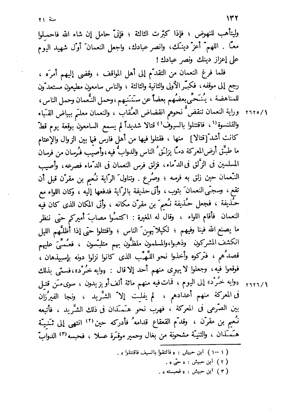 وليتأهب للنهوض، فإذا كبرت الثالثة، فإني حامل إن شاء اللَّه فاحملوا معا اللهم أعز دينك، وانصر عبادك، واجعل النعمان أول شهيد اليوم على إعزاز دينك ونصر عبادك! فلما فرغ النعمان من التقدم إلى أهل المواقف، وقضى إليهم أمره، رجع إلى موقفه، فكبر الأولى والثانية والثالثة، والناس سامعون مطيعون مستعدون للمناهضة، ينحي بعضهم بعضا عن سننهم، وحمل النعمان وحمل الناس، وراية النعمان تنقض نحوهم انقضاض العقاب، والنعمان معلم ببياض القباء والقلنسوة، فاقتتلوا بالسيوف قتالا شديدا لم يسمع السامعون بوقعه يوم قط كانت أشد قتالا منها، فقتلوا فيها من أهل فارس فيما بين الزوال والإعتام ما طبق أرض المعركة دما يزلق الناس والدواب فيه، وأصيب فرسان من فرسان المسلمين في الزلق في الدماء، فزلق فرس النعمان في الدماء فصرعه، وأصيب النعمان حين زلق به فرسه، وصرع وتناول الراية نعيم بْن مقرن قبل أن تقع، وسجى النعمان بثوب، وأتى حذيفة بالراية فدفعها إليه، وكان اللواء مع حذيفة، فجعل حذيفة نعيم بْن مقرن مكانه، وأتى المكان الذي كان فيه النعمان فأقام اللواء، وقال له المغيرة: اكتموا مصاب أميركم حتى ننظر ما يصنع اللَّه فينا وفيهم، لكيلا يهن الناس، واقتتلوا حتى إذا أظلهم الليل انكشف المشركون وذهبوا، والمسلمون ملظون بهم متلبسون، فعمي عليهم قصدهم، فتركوه وأخذوا نحو اللهب الذي كانوا نزلوا دونه بإسبيذهان، فوقعوا فيه، وجعلوا لا يهوي منهم أحد إلا قال: وايه خرد، فسمي بذلك وايه خرد إلى اليوم، فمات فيه منهم مائة ألف أو يزيدون، سوى من قتل في المعركة منهم اعدادهم لم يفلت إلا الشريد، ونجا الفيرزان بين الصرعى في المعركة، فهرب نحو همدان في ذلك الشريد، فأتبعه نعيم بْن مقرن، وقدم القعقاع قدامه فأدركه حين انتهى إلى ثنية همدان، والثنية مشحونة من بغال وحمير موقرة عسلا، فحبسه الدواب