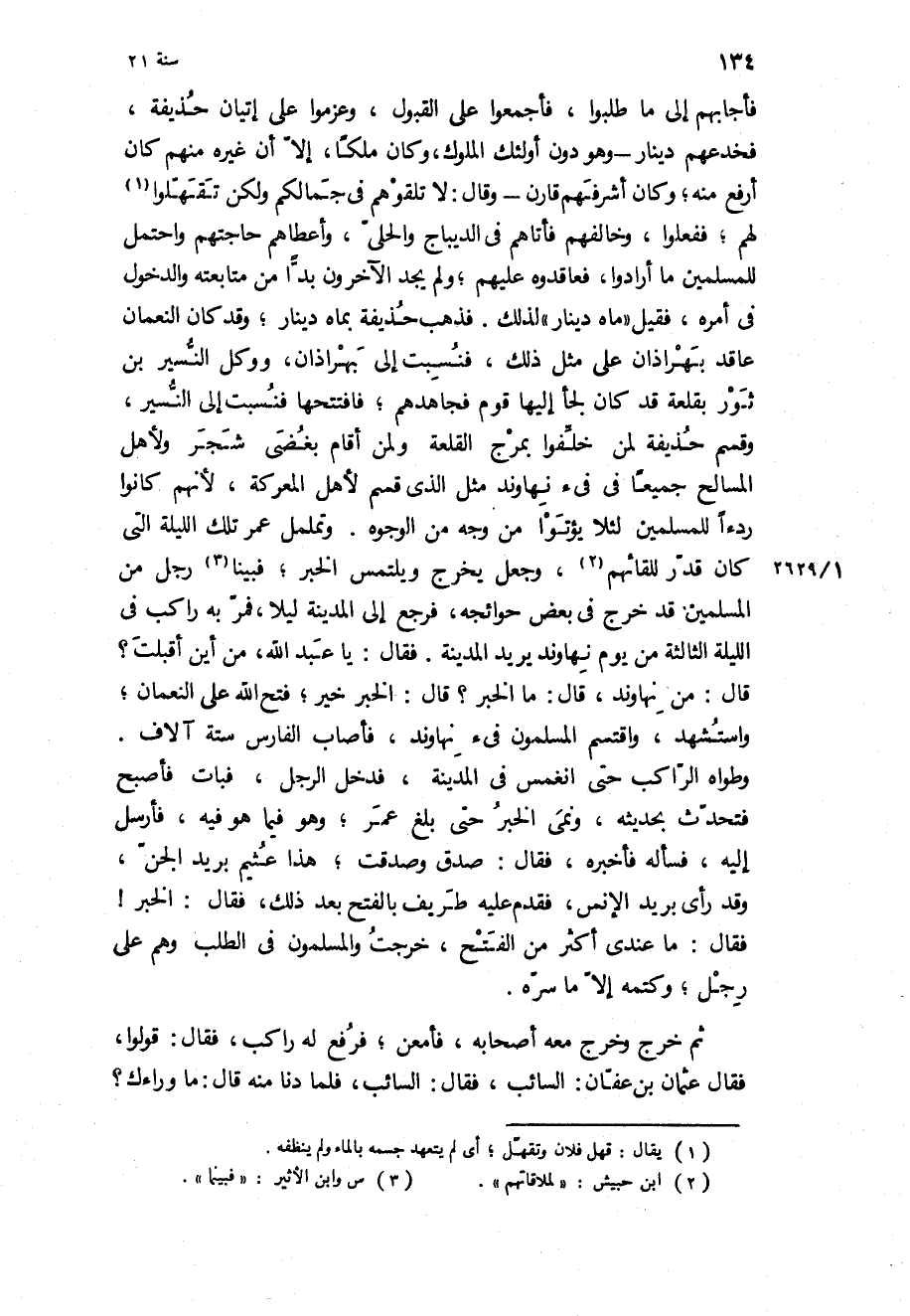 فأجابهم إلى ما طلبوا، فأجمعوا على القبول، وعزموا على إتيان حذيفة، فخدعهم دينار- وهو دون أولئك الملوك، وكان ملكا، إلا أن غيره منهم كان أرفع منه، وكان أشرفهم قارن- وقال: لا تلقوهم في جمالكم ولكن تقهلوا لهم، ففعلوا، وخالفهم فآتاهم في الديباج والحلي، وأعطاهم حاجتهم واحتمل للمسلمين ما أرادوا، فعاقدوه عليهم، ولم يجد الآخرون بدا من متابعته والدخول في أمره، فقيل ماه دينار لذلك فذهب حذيفة بماه دينار، وقد كان النعمان عاقد بهراذان على مثل ذلك، فنسبت إلى بهراذان، ووكل النسير بْن ثور بقلعة قد كان لجأ إليها قوم فجاهدهم، فافتتحها فنسبت إلى النسير، وقسم حذيفة لمن خلفوا بمرج القلعة ولمن أقام بغضي شجر ولأهل المسالح جميعا في فيء نهاوند مثل الذي قسم لأهل المعركة، لأنهم كانوا ردءا للمسلمين لئلا يؤتوا من وجه من الوجوه وتململ عمر تلك الليلة التي كان قدر للقائهم، وجعل يخرج ويلتمس الخبر، فبينا رجل من المسلمين قد خرج في بعض حوائجه، فرجع إلى المدينة ليلا، فمر به راكب في الليلة الثالثة من يوم نهاوند يريد المدينة فقال: يا عبد اللَّه، من أين أقبلت؟